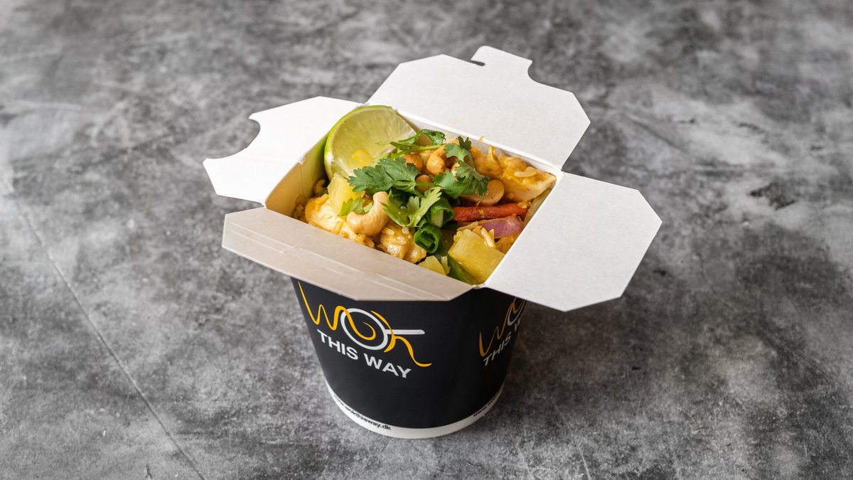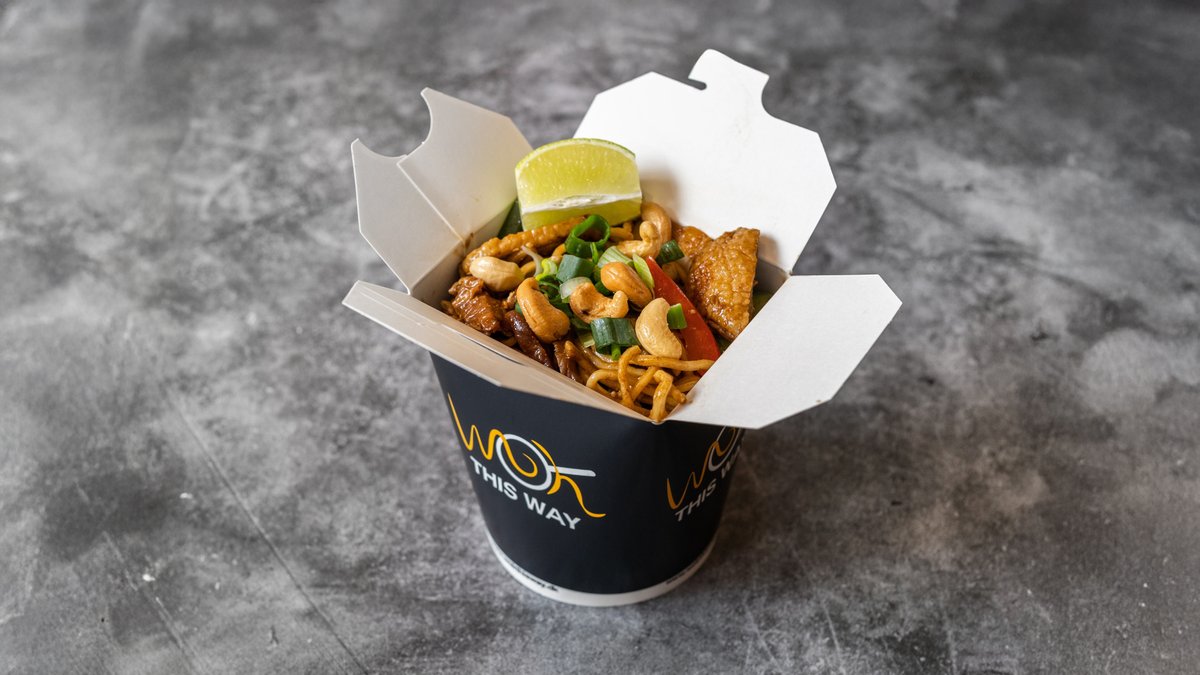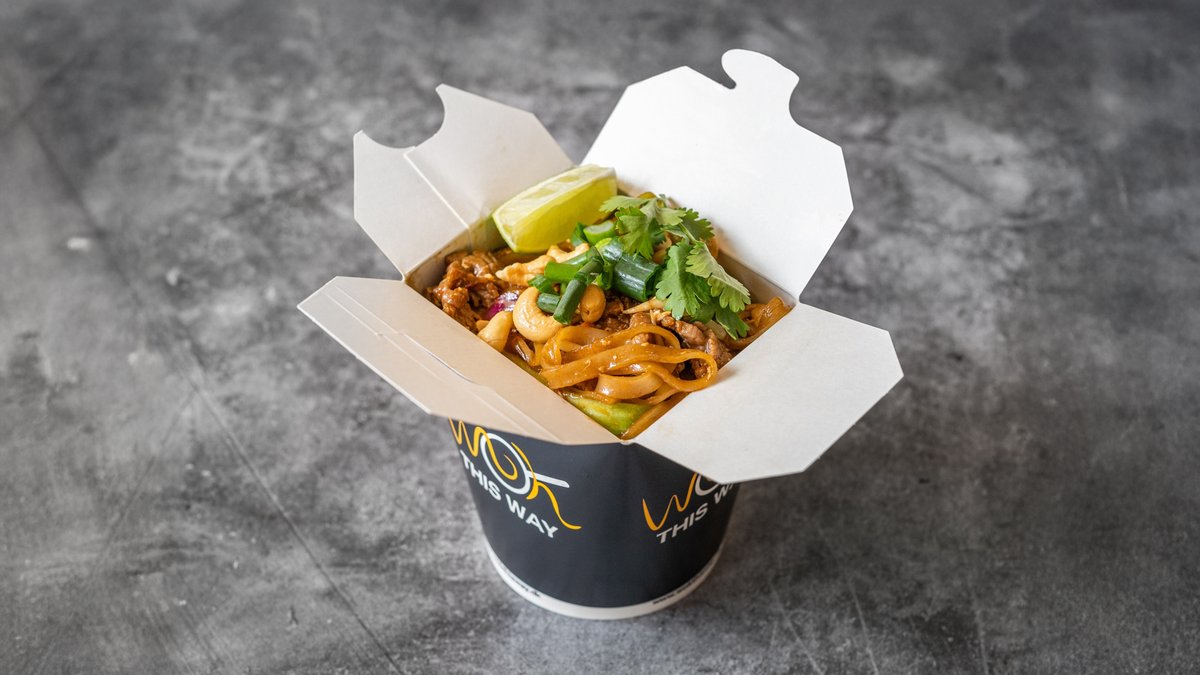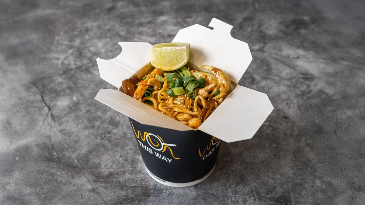 Gule nudler, tofu, æg, kål, gulerødder, broccoli, pak choi, rødløg og shiitake svampe. Toppes med koriander, peanuts og teriyaki sauce. Serveres med en valgfri dåsesodavand.
