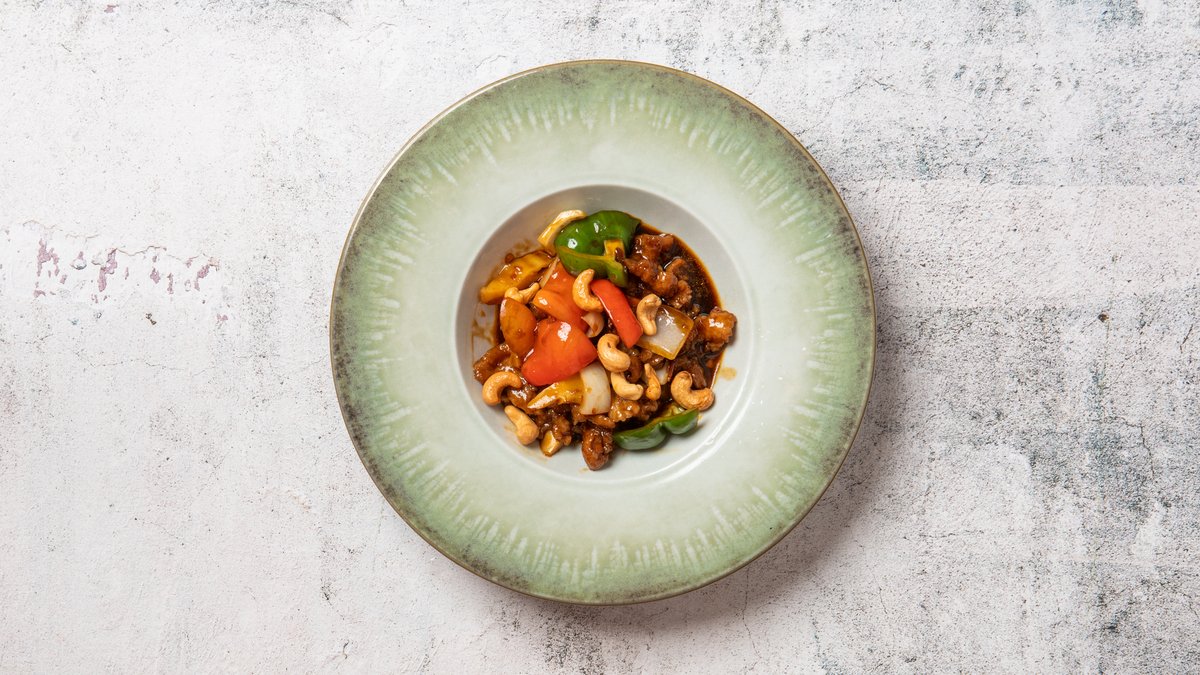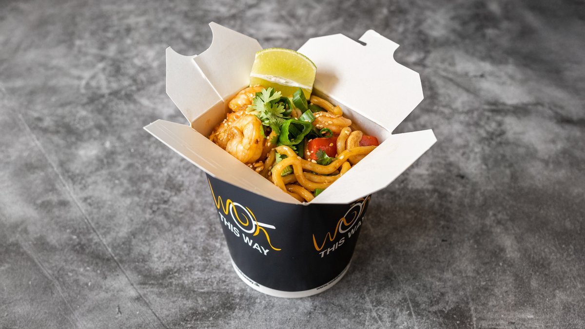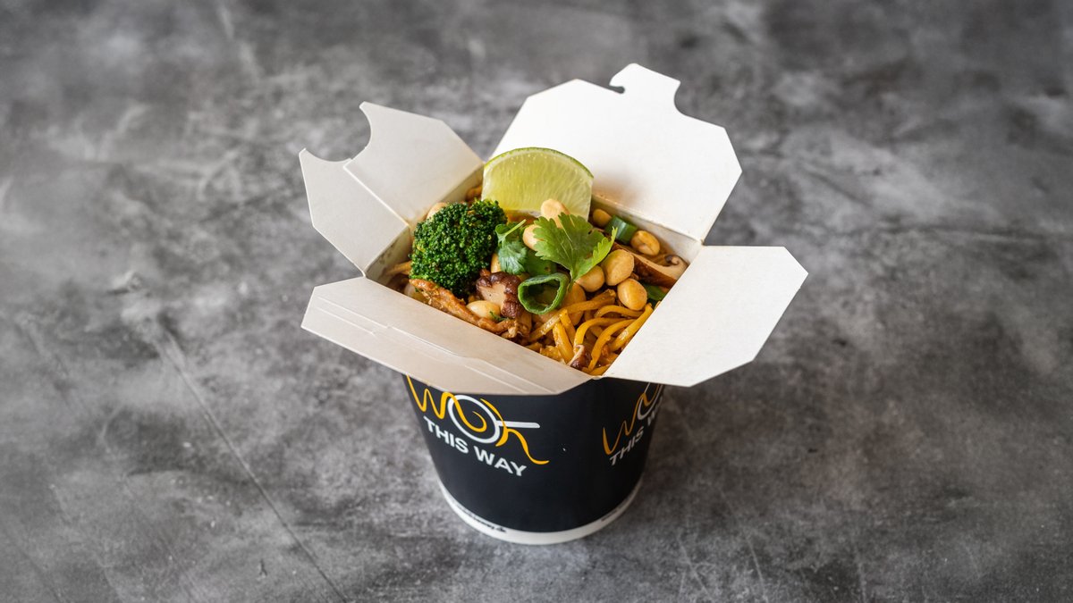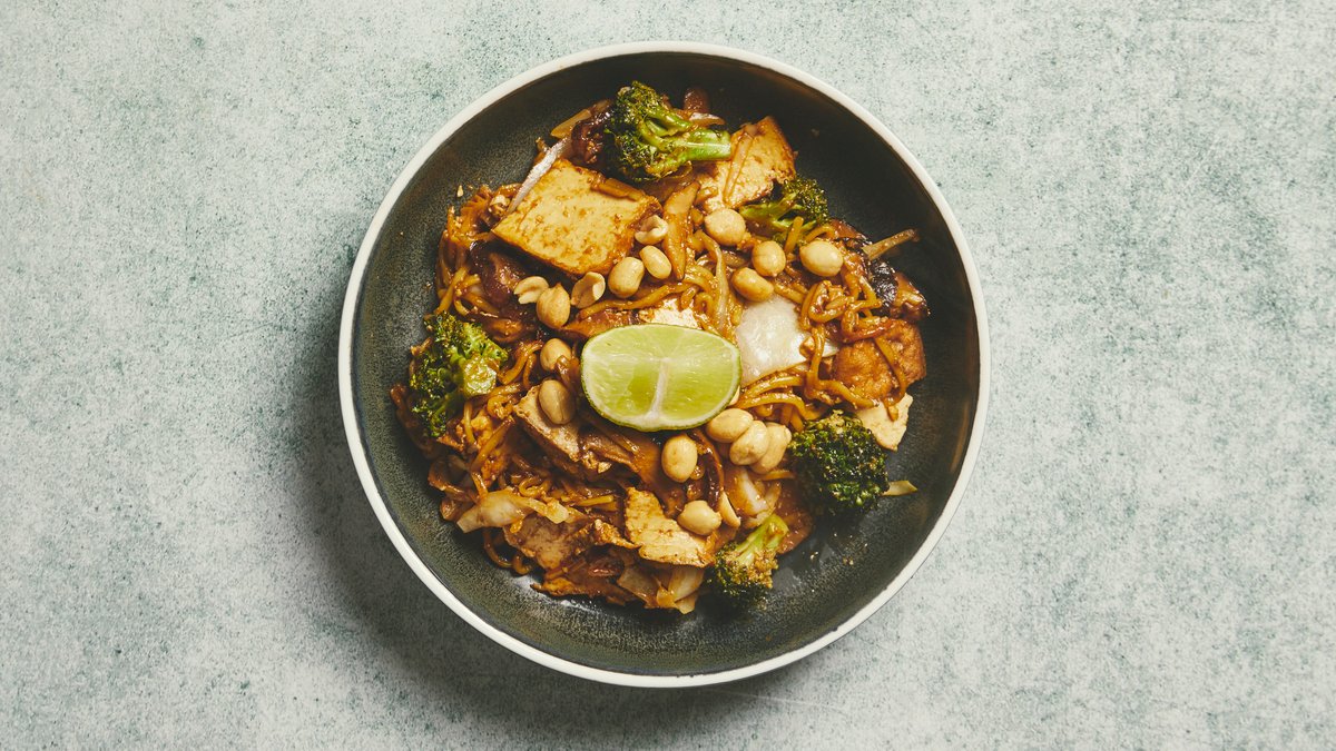 Gule nudler, tofu, æg, kål, gulerødder, broccoli, pak choi, rødløg og shiitake svampe. Toppes med koriander, peanuts og teriyaki sauce. Serveres med en valgfri dåsesodavand.