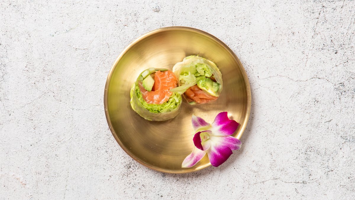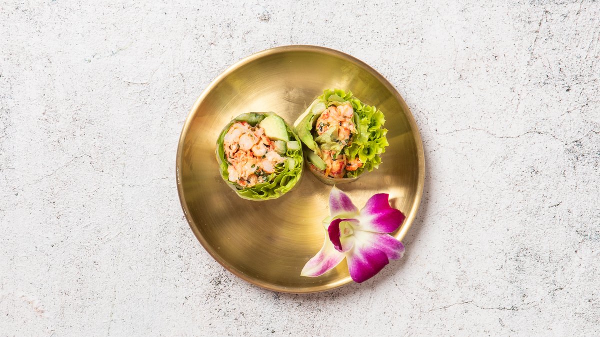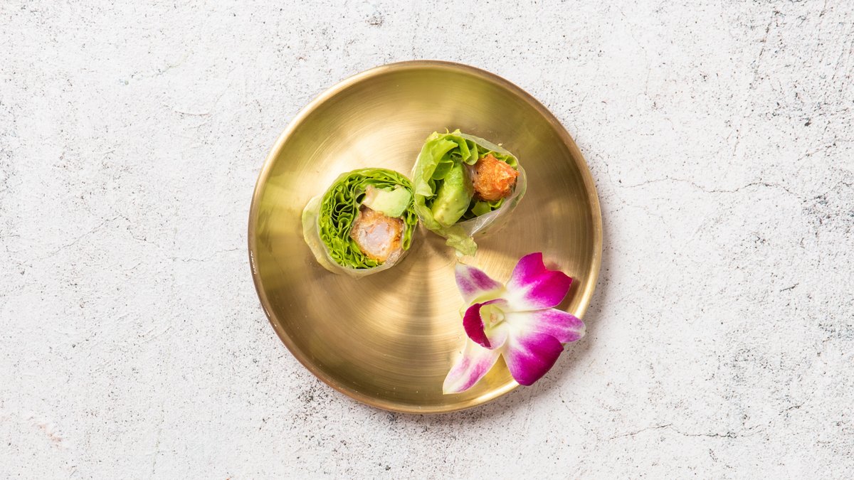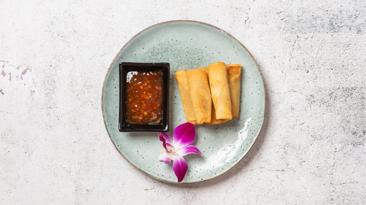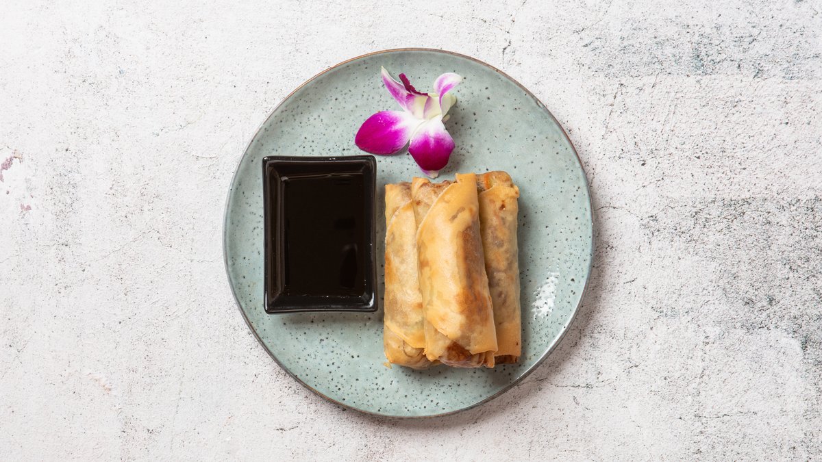 Forårsruller med hakket oksekød og grøntsager. Serveres med soya.