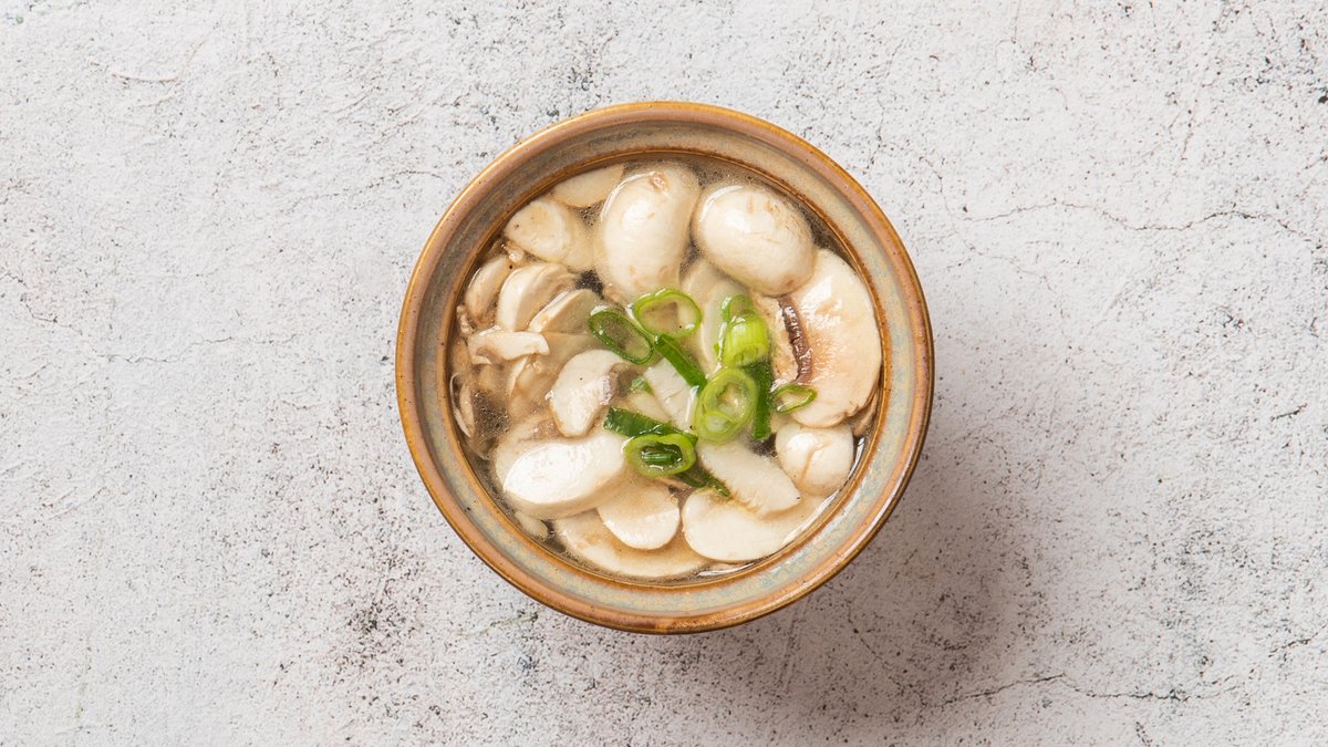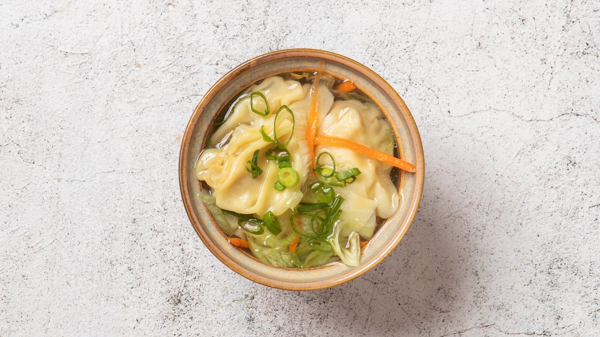 Svinekødssuppe med wan-tans, hakket svinekød og grøntsager.