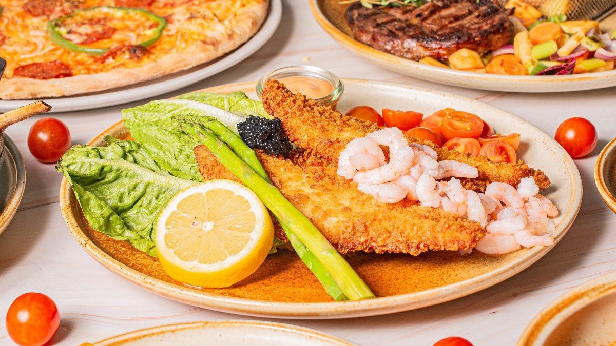 Stegte rødspættefileter, ristet toast, sprød salat, rejer, skaldyrsdressing, asparges og kaviar.