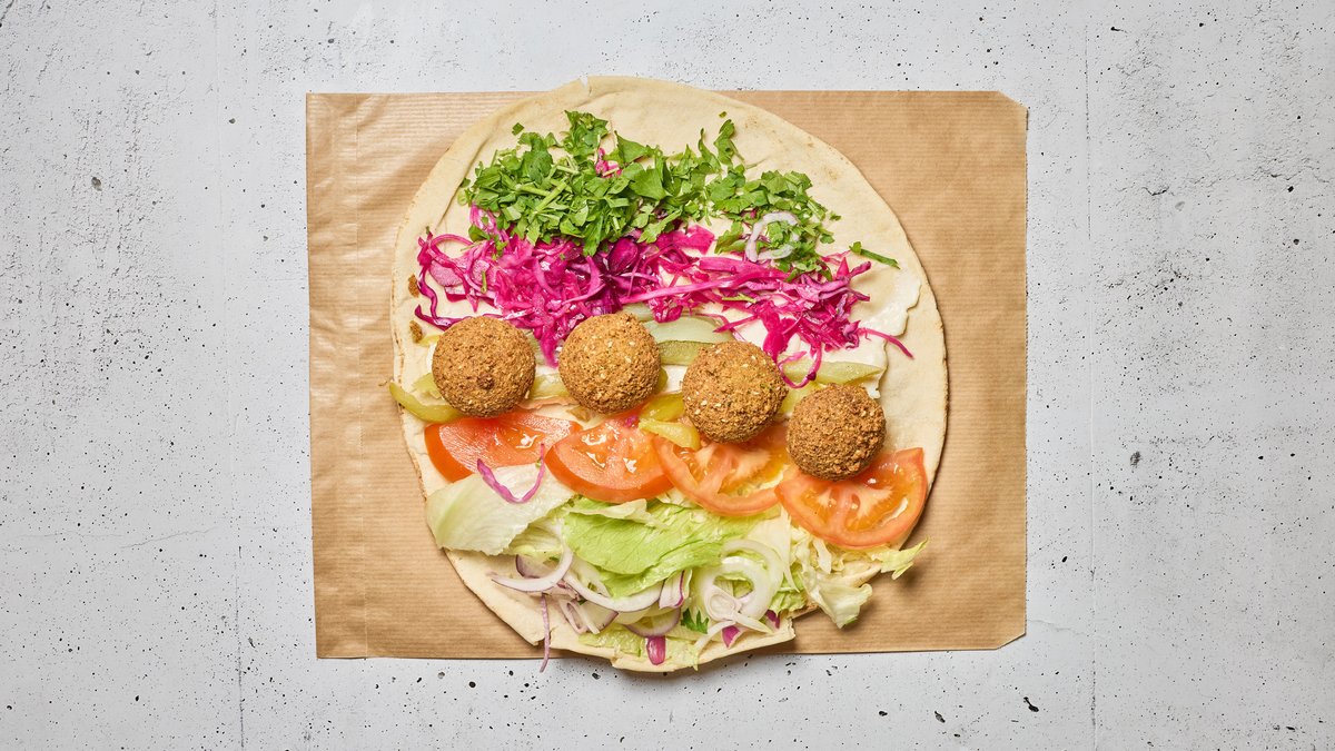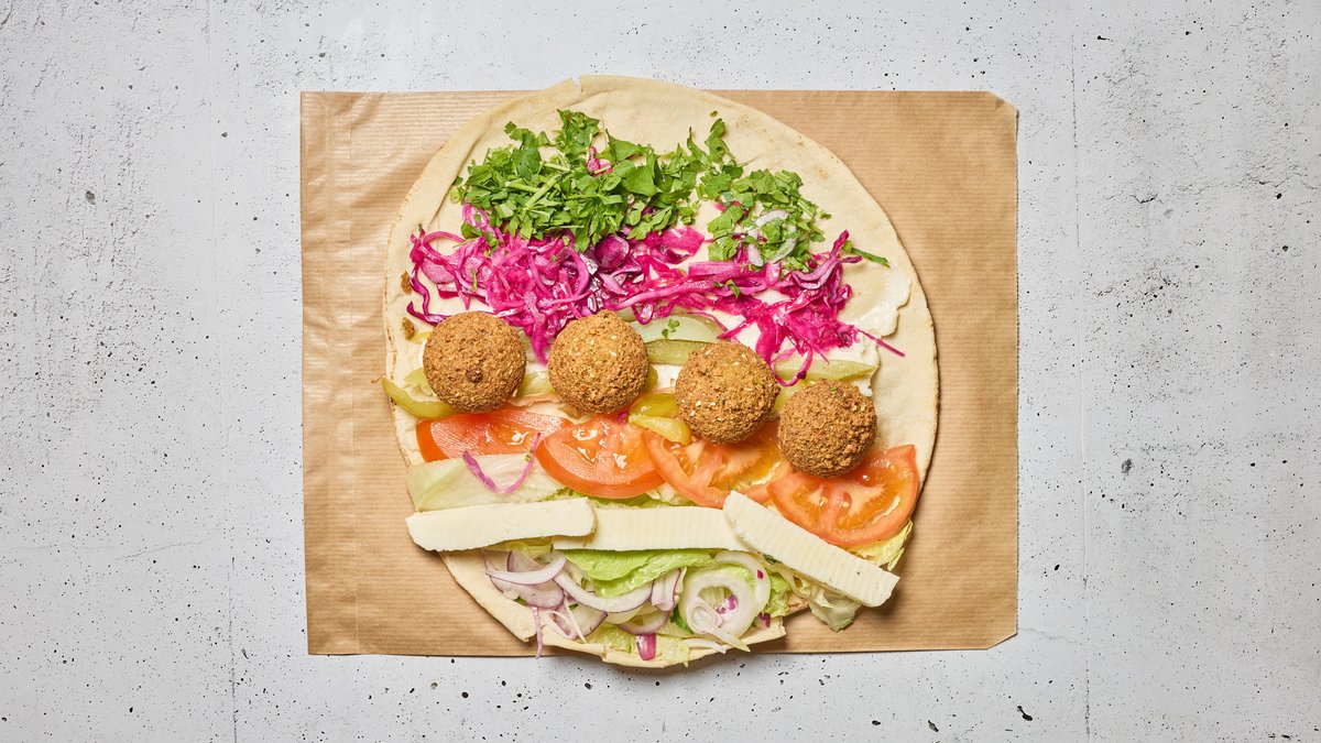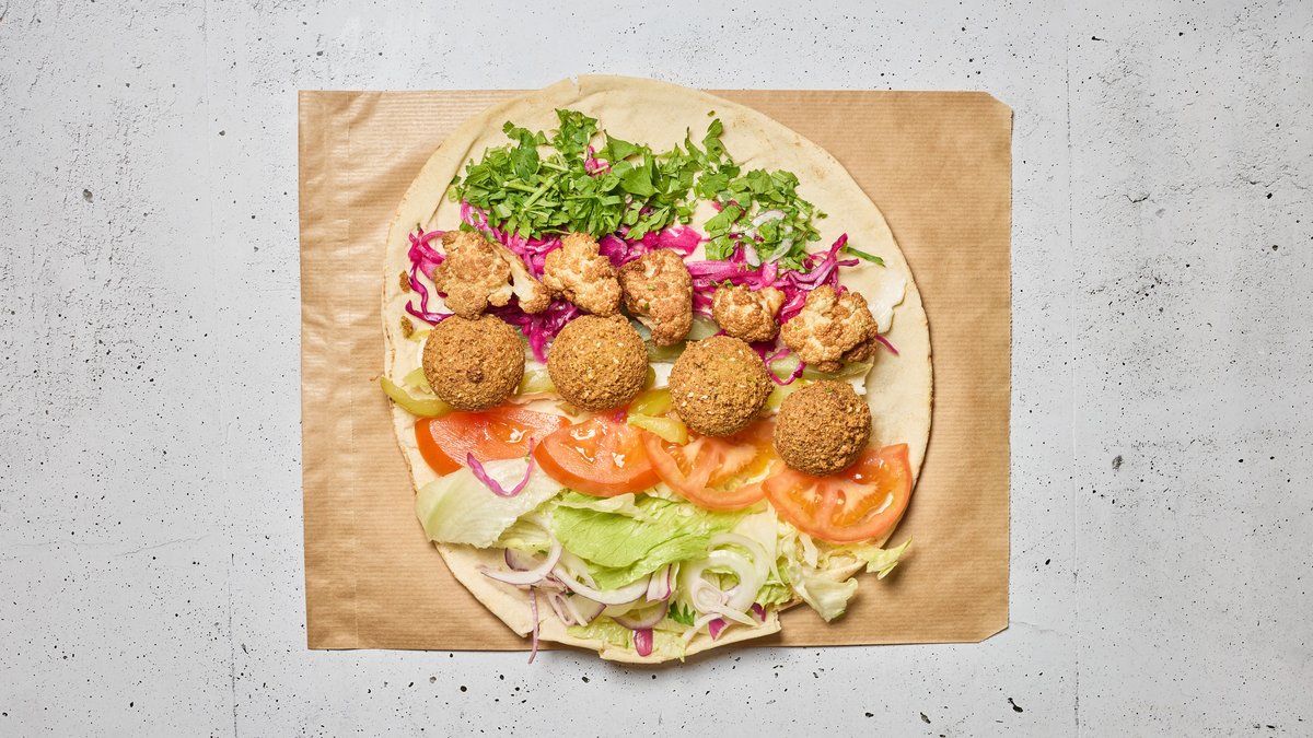 Durumrulle med falafel, aubergine, tomater, syltede agurker, persille, mynte, rødkål og salat, samt valgfri dressing.