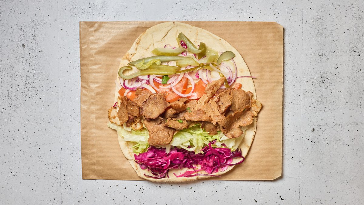 Durumrulle med kebab, tomater, syltede agurker, persille, mynte, rødkål og salat, samt valgfri dressing.
