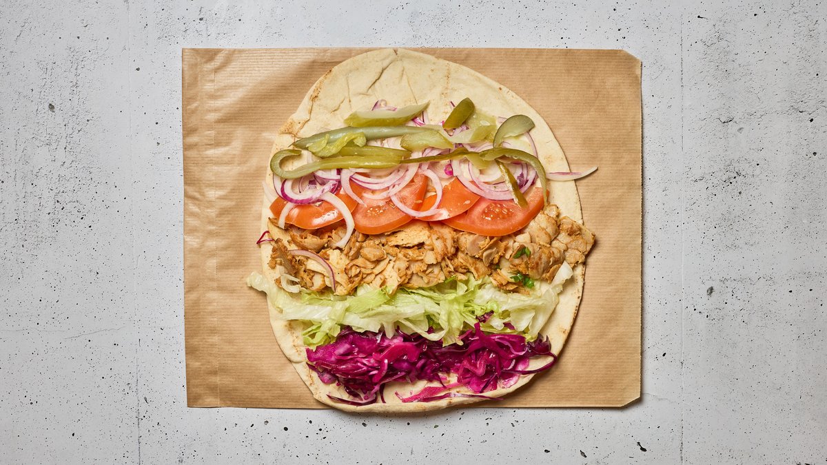 Durumrulle med valgfri vegansk protein, tomater, syltede agurker, persille, mynte, rødkål og salat, samt valgfri dressing.