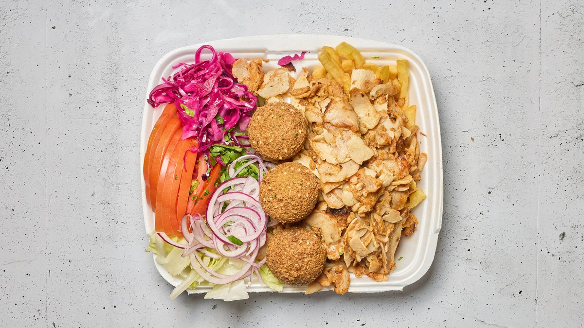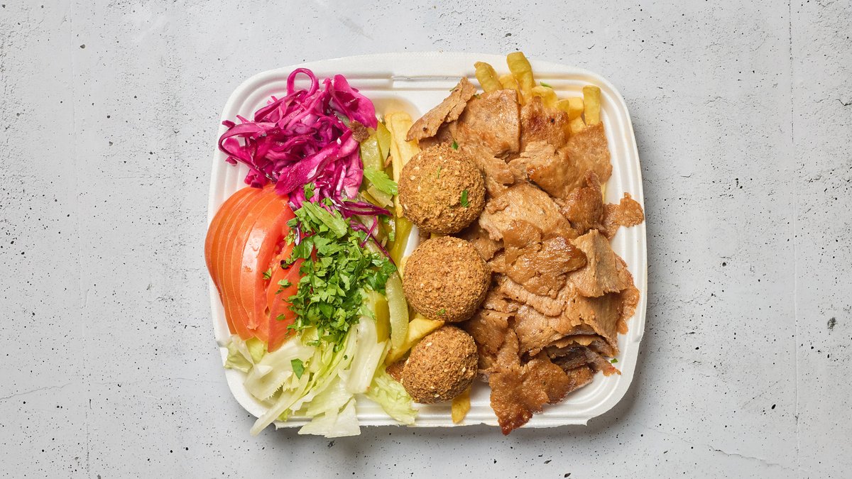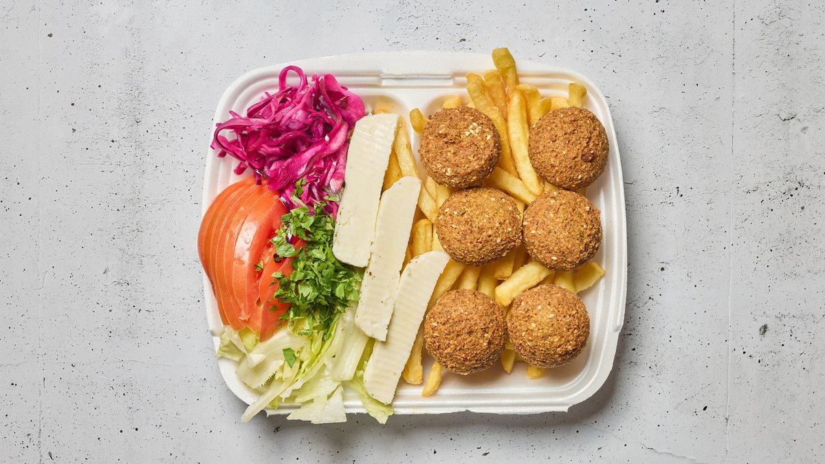 Box med falafel, kebab, tomater, syltede agurker, persille, mynte, rødkål og salat, samt valgfri dressing.