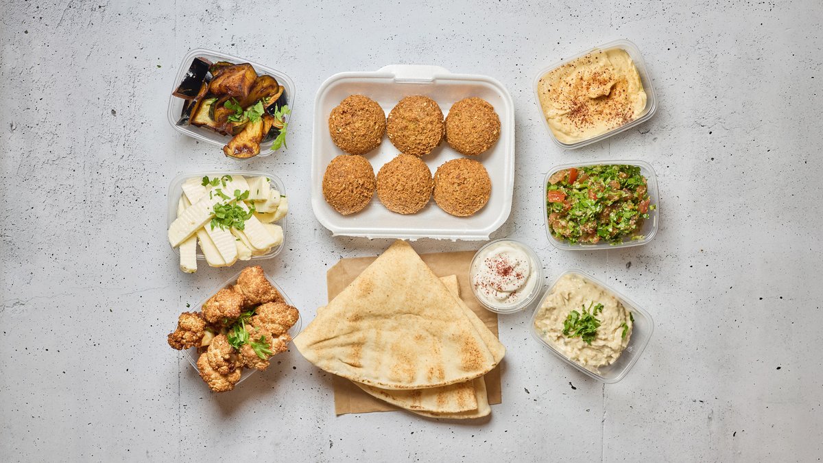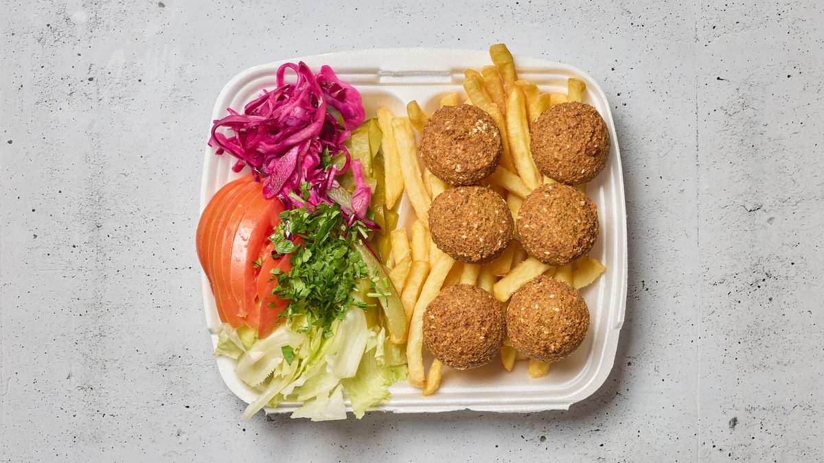 Box med falafel, aubergine, tomater, syltede agurker, persille, mynte, rødkål og salat, samt valgfri dressing.