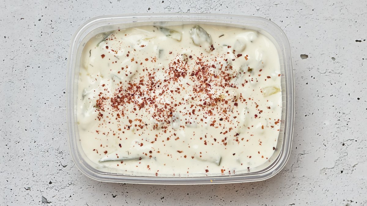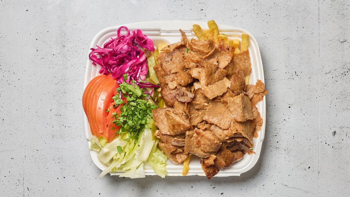 Box med kebab, tomater, syltede agurker, persille, mynte, rødkål og salat, samt valgfri dressing.