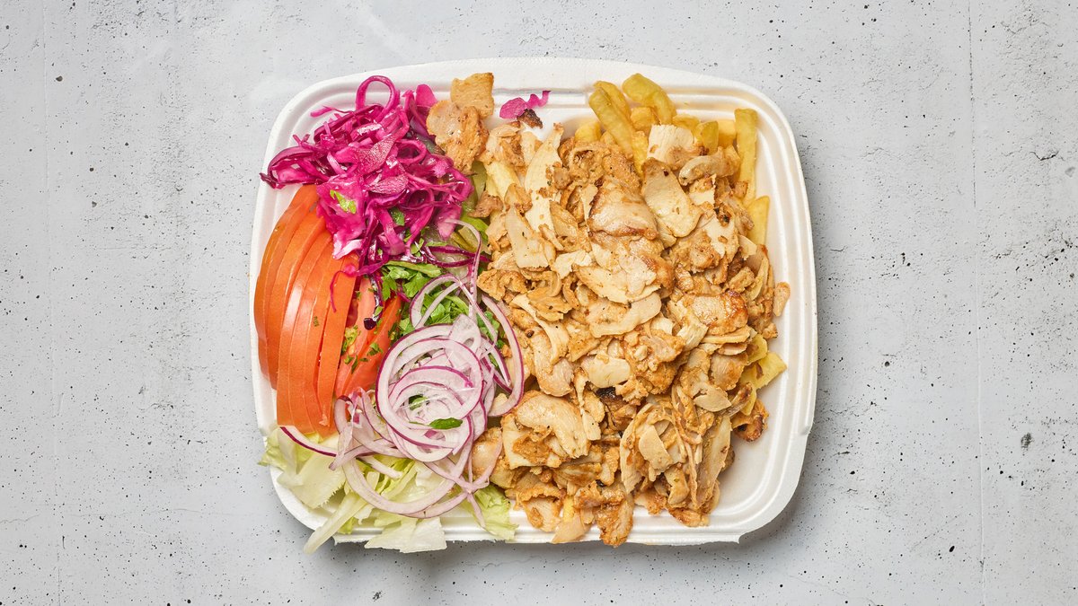 Box med crispy chicken, tomater, syltede agurker, persille, mynte, rødkål og salat, samt valgfri dressing.
