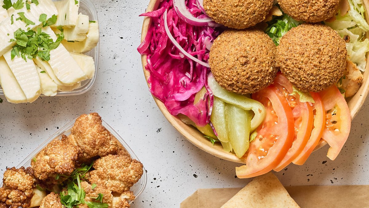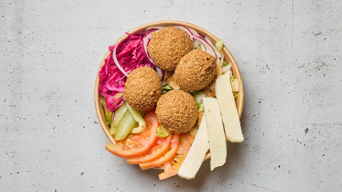 Bowl med falafel, salatost, tomater, syltede agurker, persille, mynte, rødkål og salat, samt valgfri dressing.