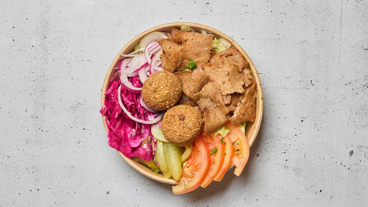 Bowl med falafel, kebab, tomater, syltede agurker, persille, mynte, rødkål og salat, samt valgfri dressing.
