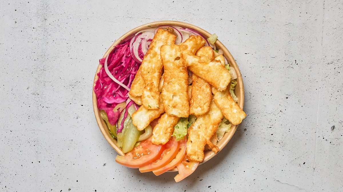 Bowl med halloumi, tomater, syltede agurker, persille, mynte, rødkål og salat, samt valgfri dressing.