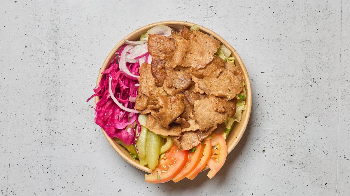 Bowl med valgfri vegansk protein, tomater, syltede agurker, persille, mynte, rødkål og salat, samt valgfri dressing.