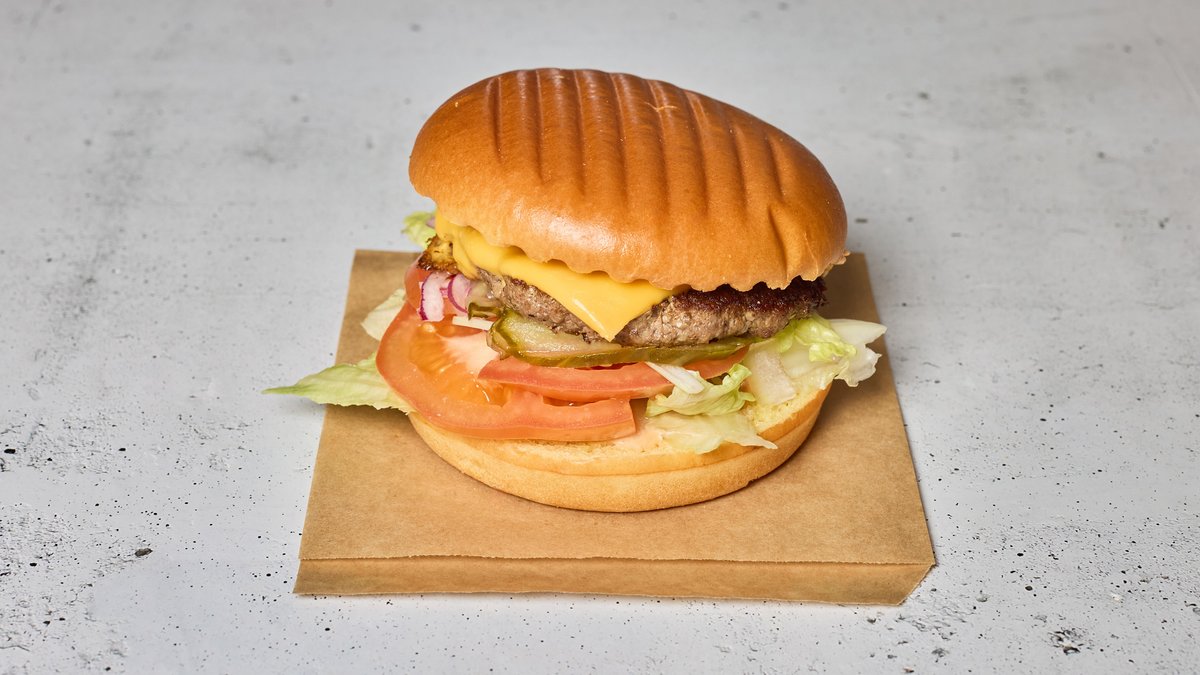 Bøf af oksekød, ost, tomat, løg, syltede agurker og salat.