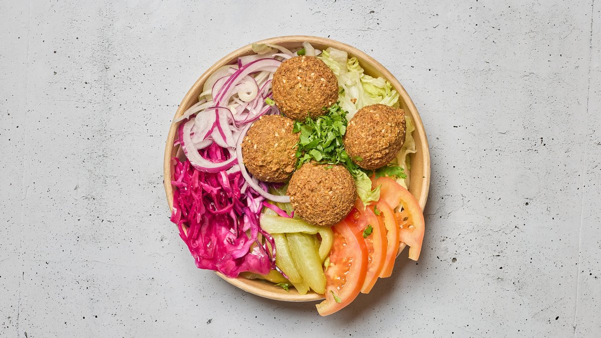 Bowl med falafel, tomater, syltede agurker, persille, mynte, rødkål og salat, samt valgfri dressing.