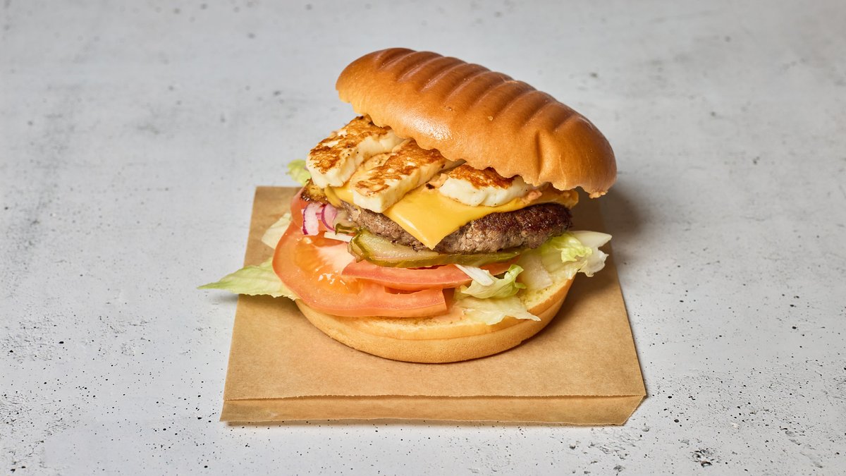 Bøf af oksekød, tomat, løg, syltede agurker, halloumiost, hvid ost og ost.