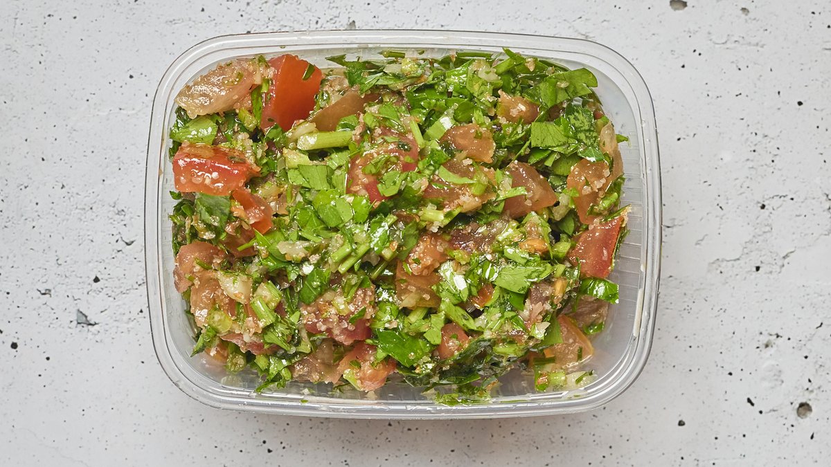 Box med valgfri vegansk protein, tomater, syltede agurker, persille, mynte, rødkål og salat, samt valgfri dressing.