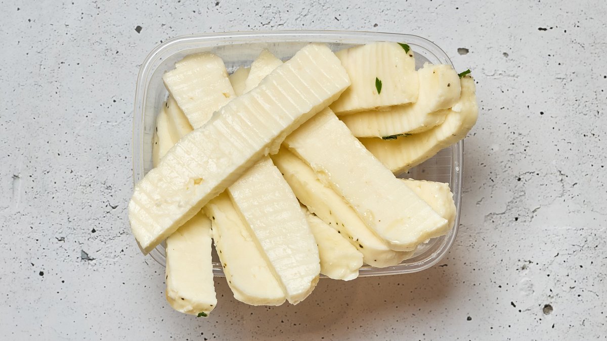 Box med halloumi, tomater, syltede agurker, persille, mynte, rødkål og salat, samt valgfri dressing.