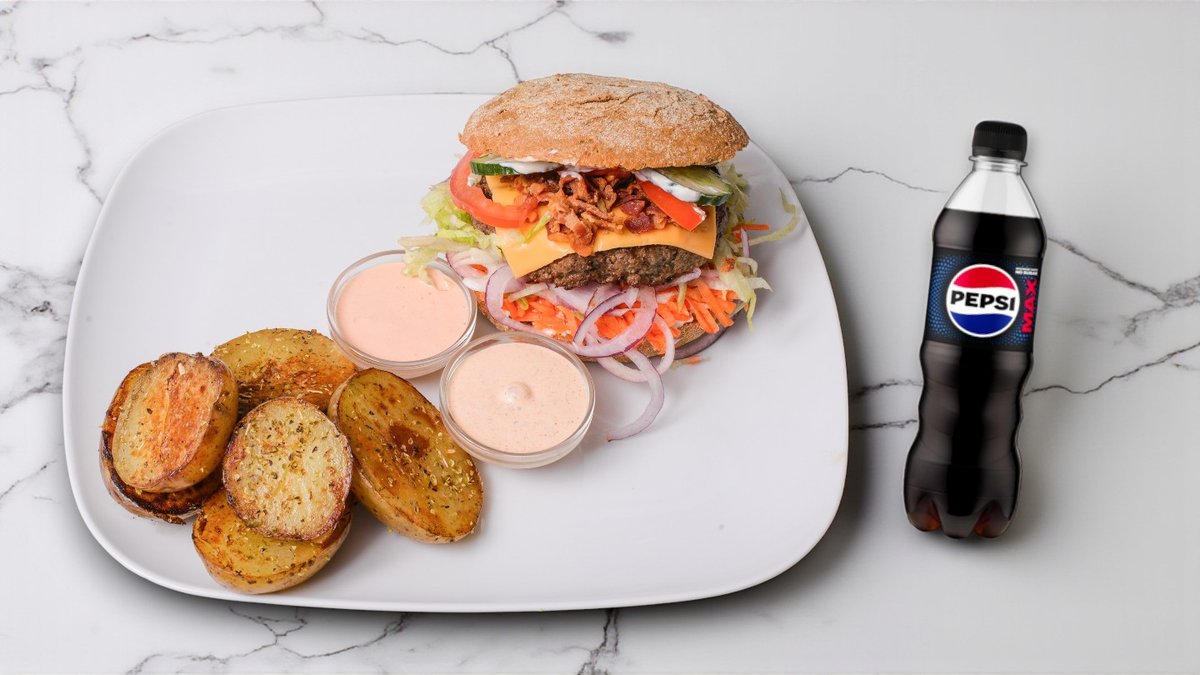 Medfølger en valgfri pepsi 0,5l. Grovbolle med fyld af oksebøf, salat, gulerod, rødløg, tomat, agurk, cheddarost, bacon og hjemmelavet dressing serveret med valgfri side.