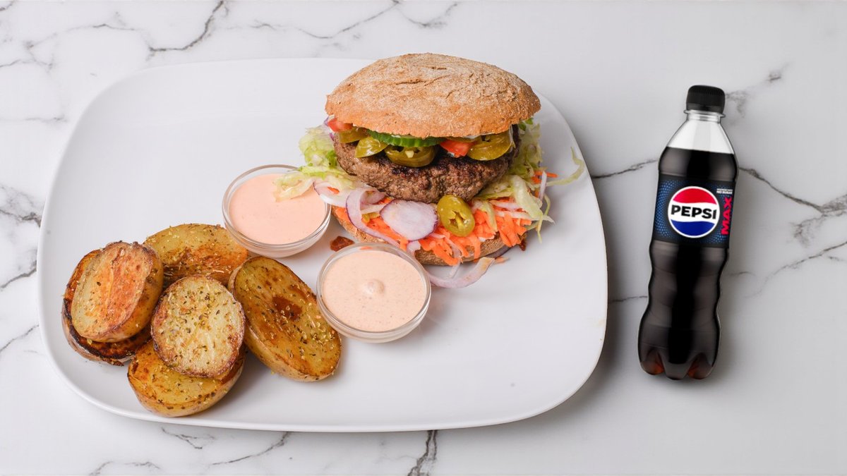 Medfølger en valgfri pepsi 0,5 l. Grovbolle med fyld af oksebøf, salat, rødløg, tomat, agurk, gulerod, jalapeños og hjemmelavet chilimayo serveret med valgfri side.