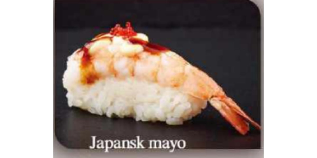 Tempura rejer, spicy mayo, avocado, toppet med sesam, teriyaki sauce og katafi.