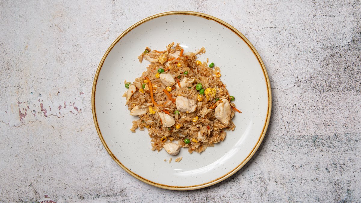 Stegte ris m. æg, kylling, gulerødder, majs og ærter.