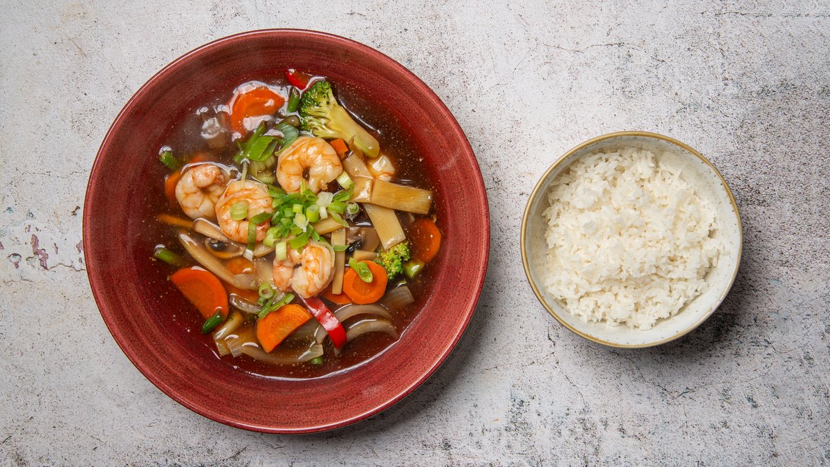 Tigerrejer, broccoli, gulerødder, peberfrugt, champignon, bambusskud, bønner, løg og klassisk woksovs