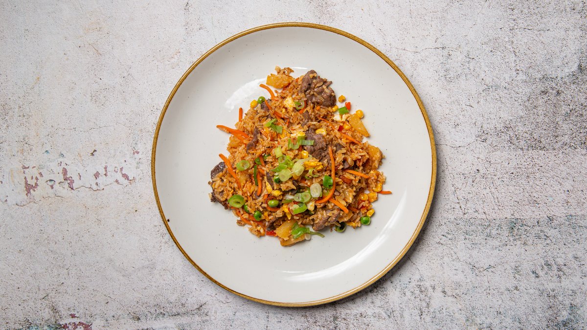 Stegte ris med oksekød, æg, ærter, ananas, majs, gulerødder og peberfrugt.