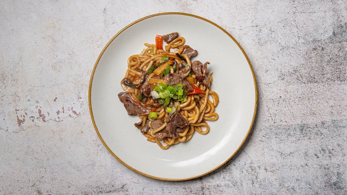 Stegte udon nudler med oksekød, peberfrugt gulerødder, bønner, champignon, bambusskud og forårsløg.