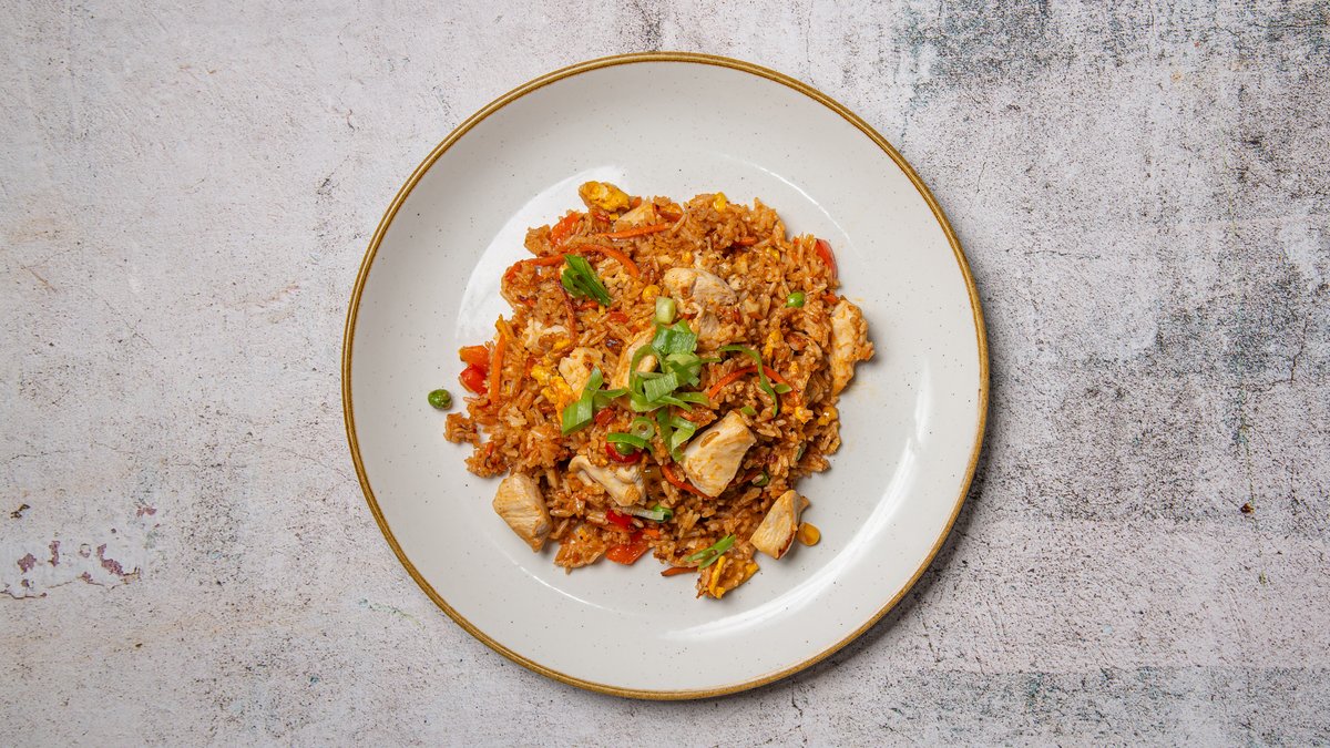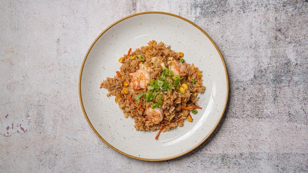 Stegte ris med kylling, tigerrejer, gulerødder, løg, ærter og majs.