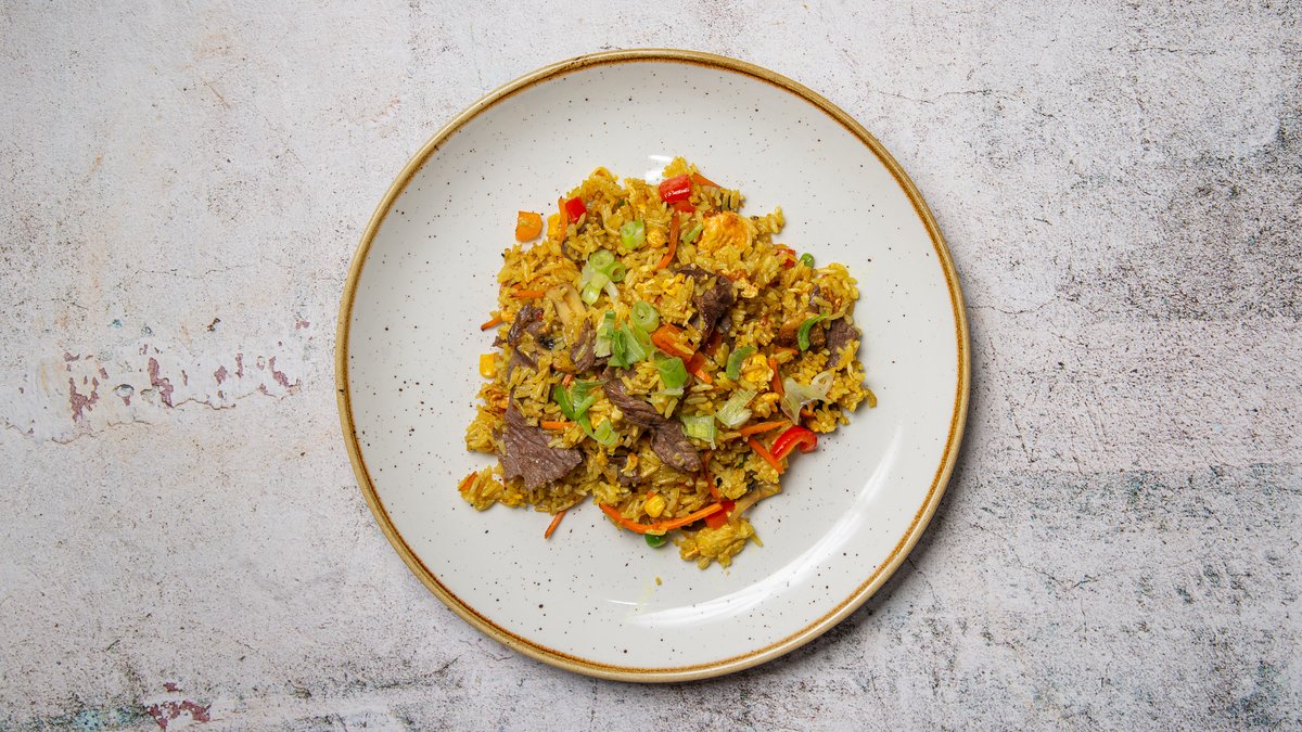 Stegte ris med oksekød, æg, peberfrugt, gulerødder, majs, champignon og ærter.