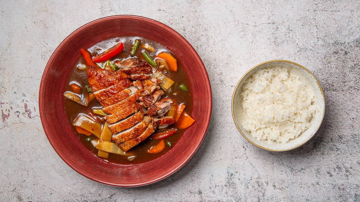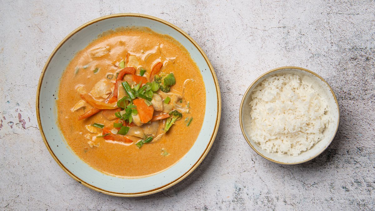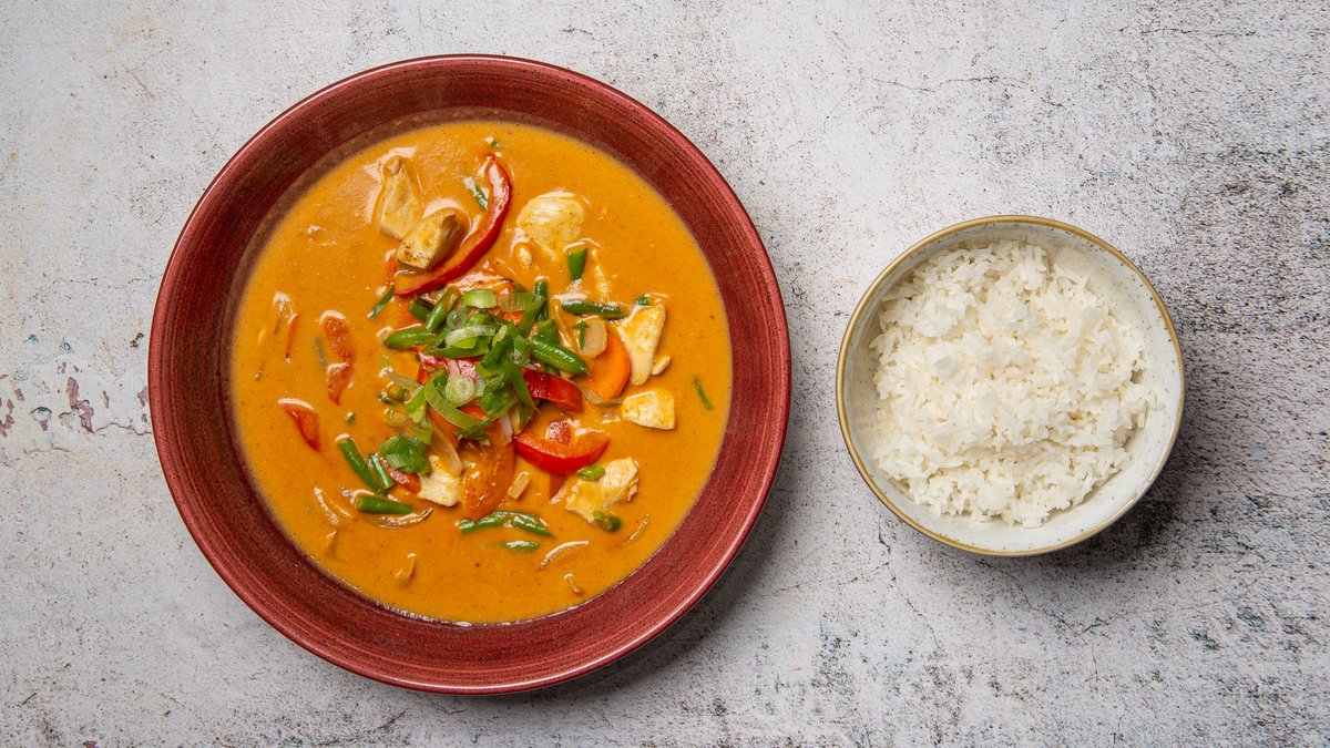 Kylling, peberfrugt, gulerødder, løg, bønner og thailandsk panang sovs.