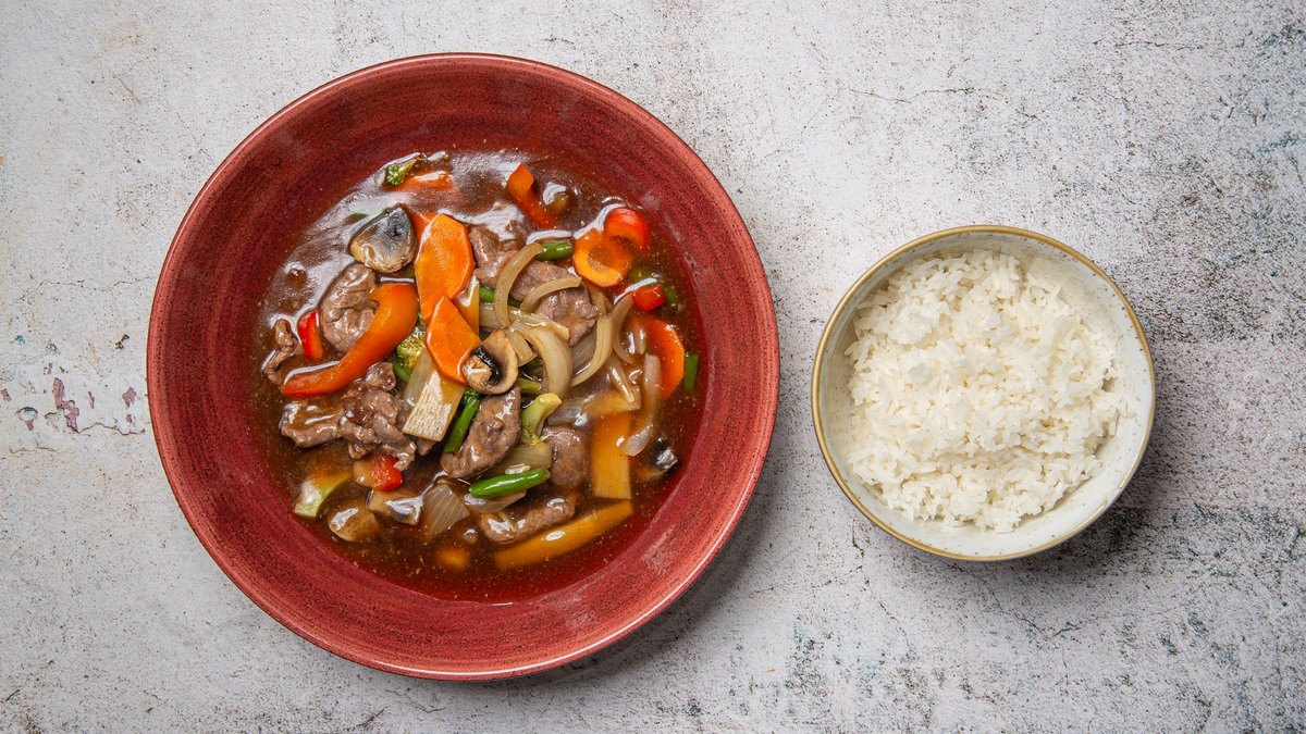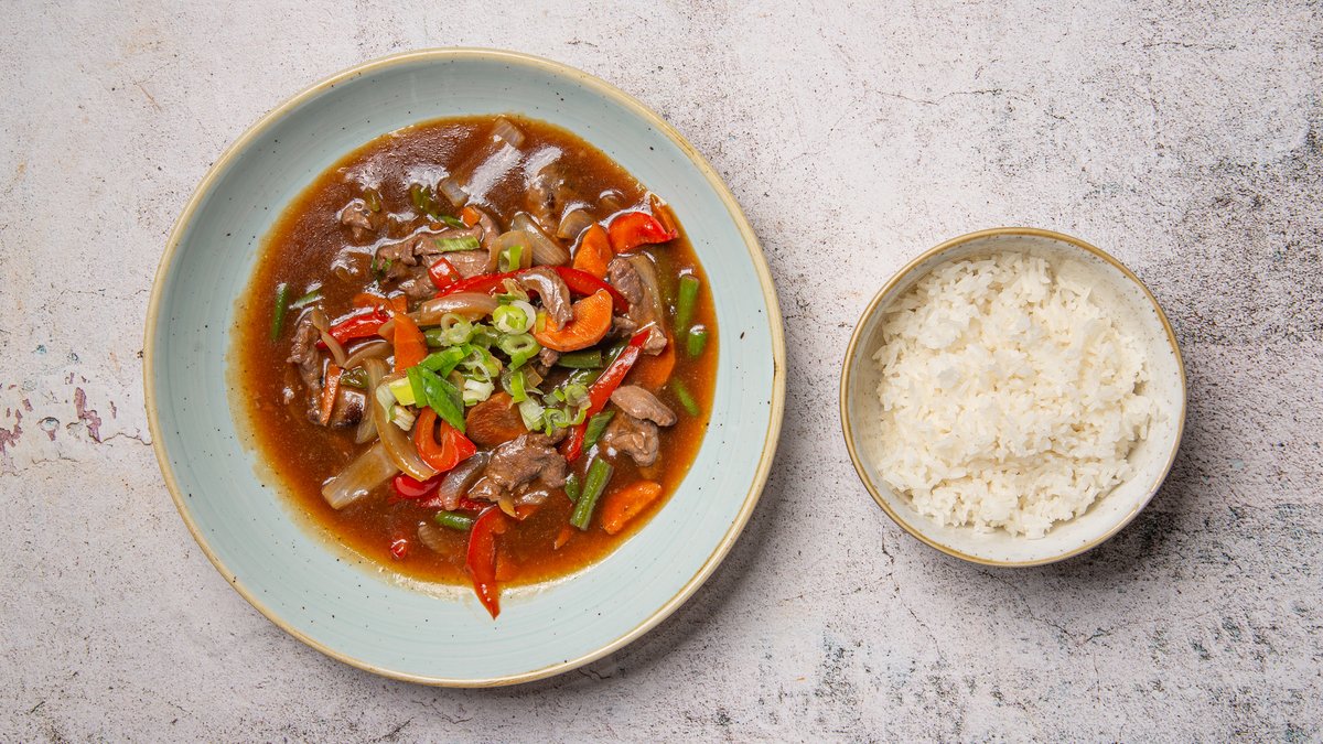 Oksekød, løg, bønner, peberfrugt, gulerødder, og aromatisk hoisinsovs.
