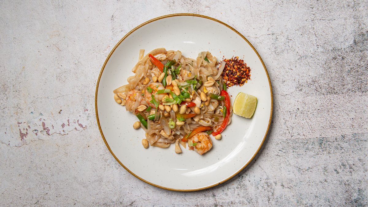 Stegte risnudler med æg, tigerrejer, kylling, løg, peberfrugt, bønner og forårsløg Serveres med peanuts, chili og en skive lime.