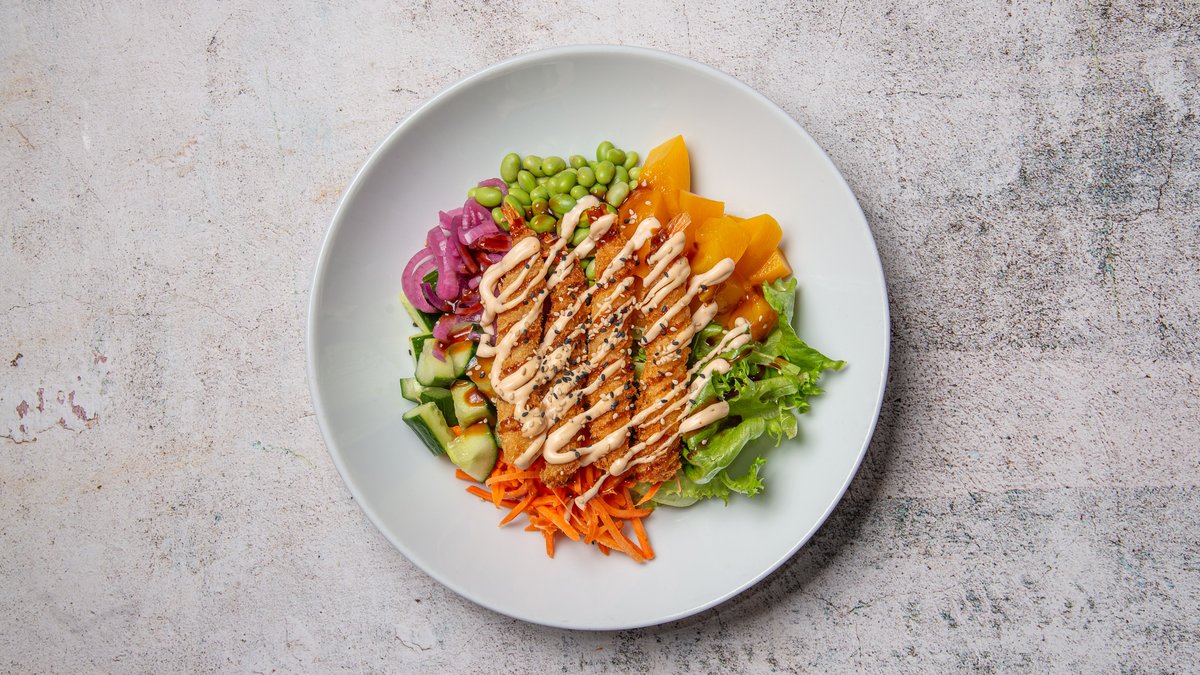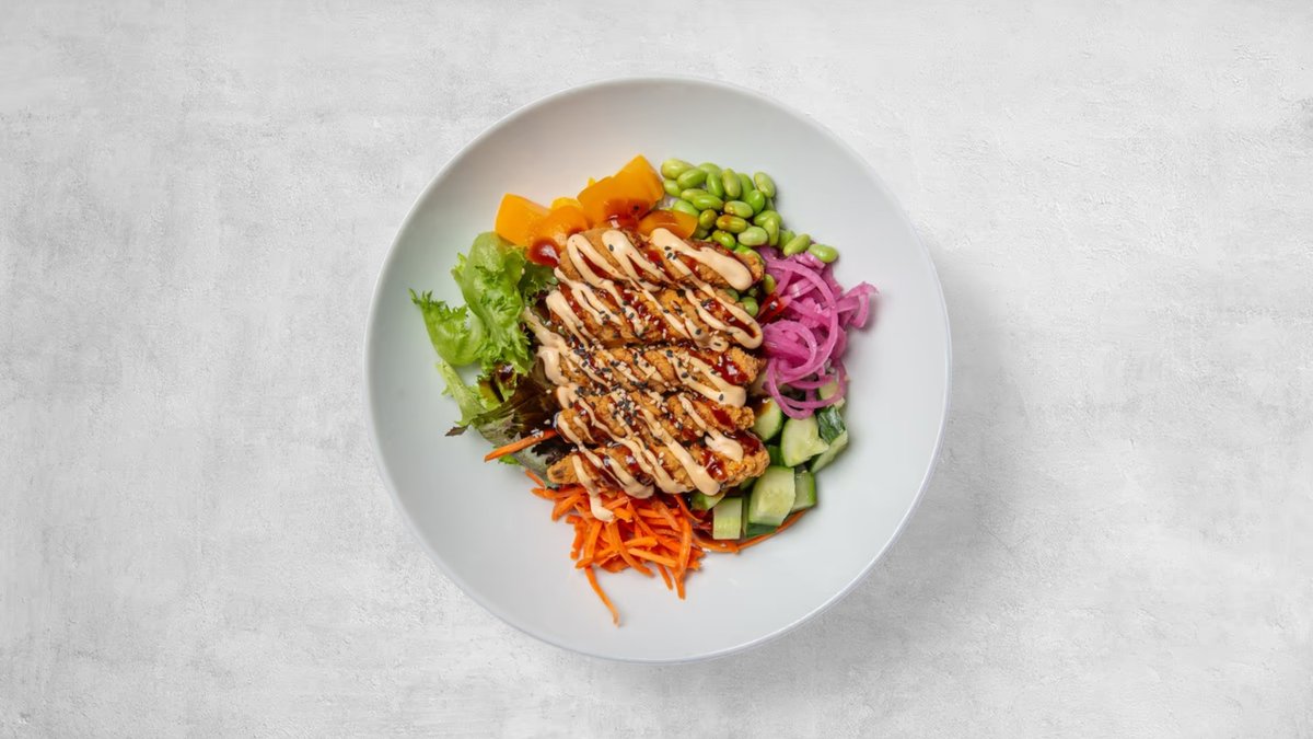 Sprød kylling, ris, edamame bønner, gulerødder, agurk, syltede fersken, salat og syltede rødløg. Toppes med hjemmelavet Teriyaki sauce, mild chili mayo og ristede sesamfrø.