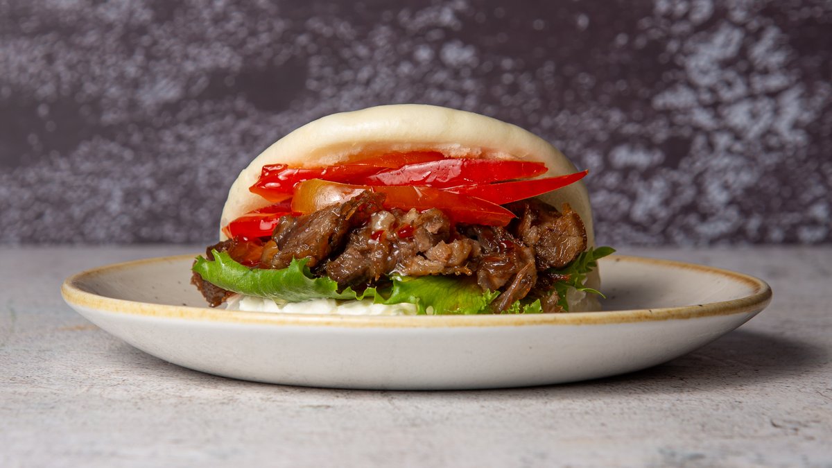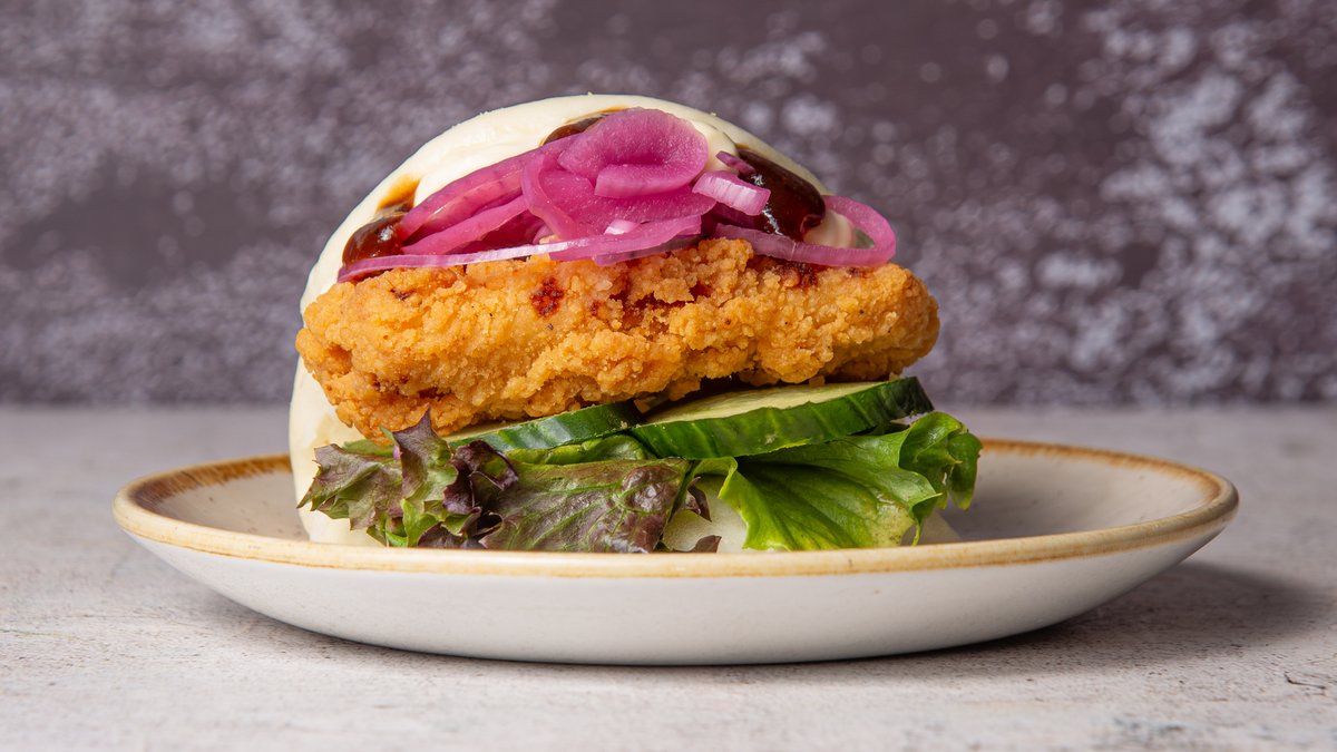 Bao bun med sprød kylling, salat, agurk, syltede rødløg, mayonnaise og asiatisk barbecue sovs.