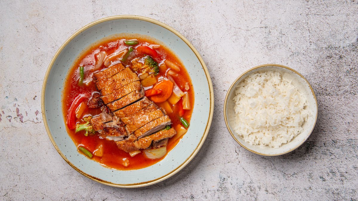 And, bambusskud, løg, bønner, broccoli gulerødder, peberfrugt, ananas og lækker sursødsovs.