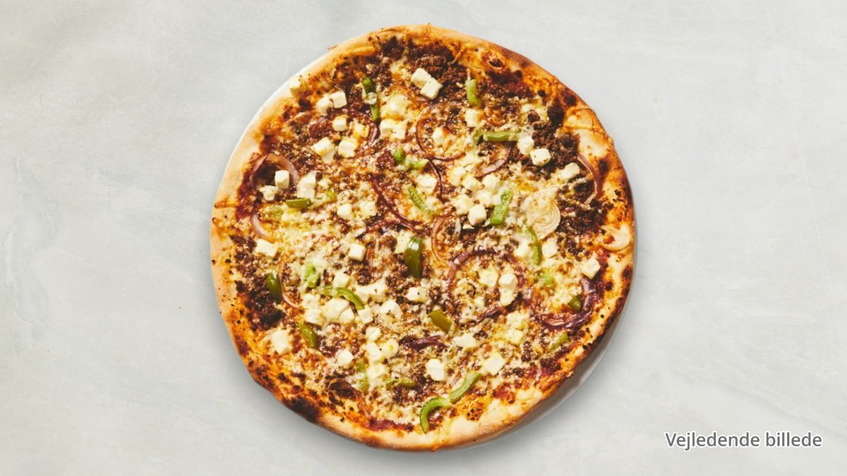 Pizzasauce, ost, pepperoni, oksekød og løg.