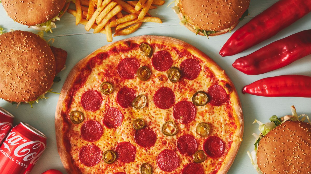Pizzasauce, ost, skinke, pepperoni, peberfrugt og pølser.
