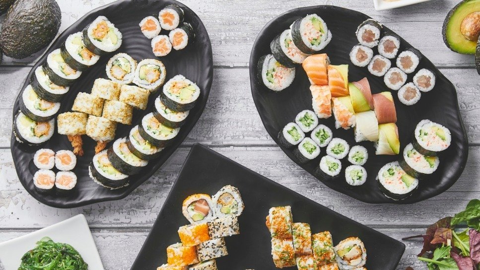 Laks, avocado, agurk, toppet med laks, tun og reje.