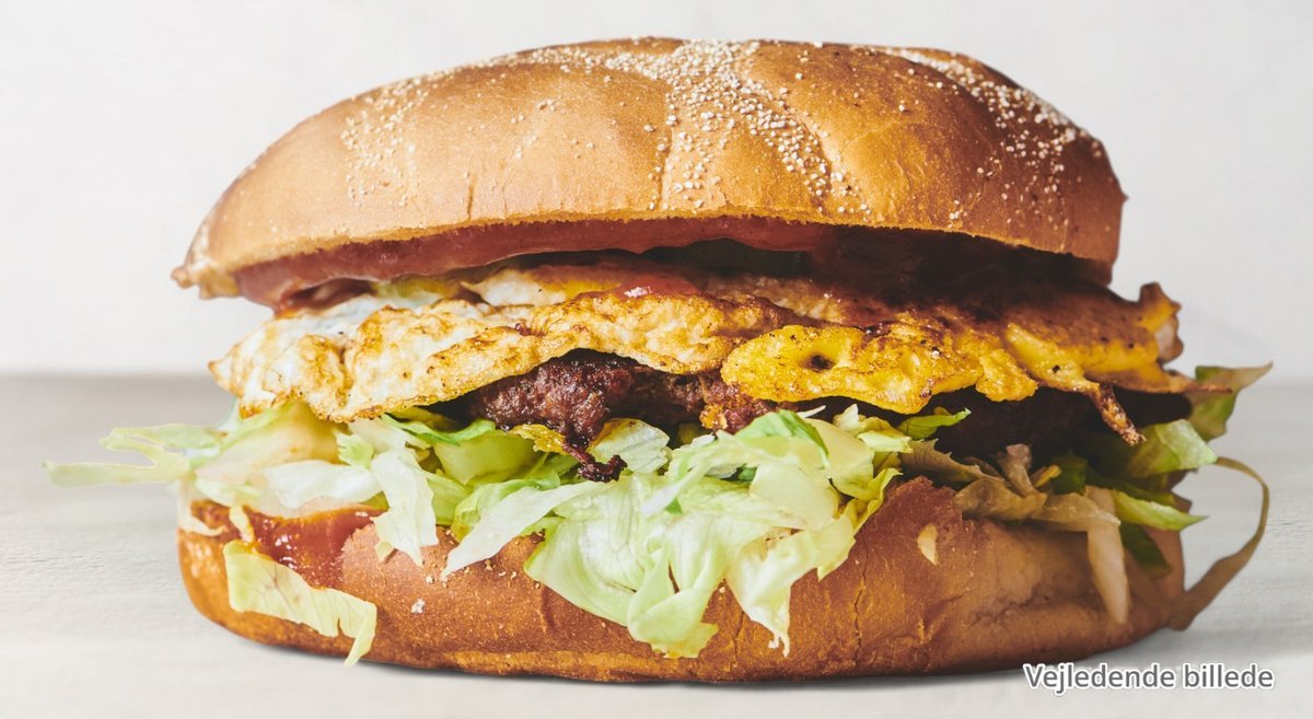 ALLE VORES BURGERS SERVERES MED SPRØDE FRITTER OG VALGFRI DYPPELSE. V - Vegetarisk