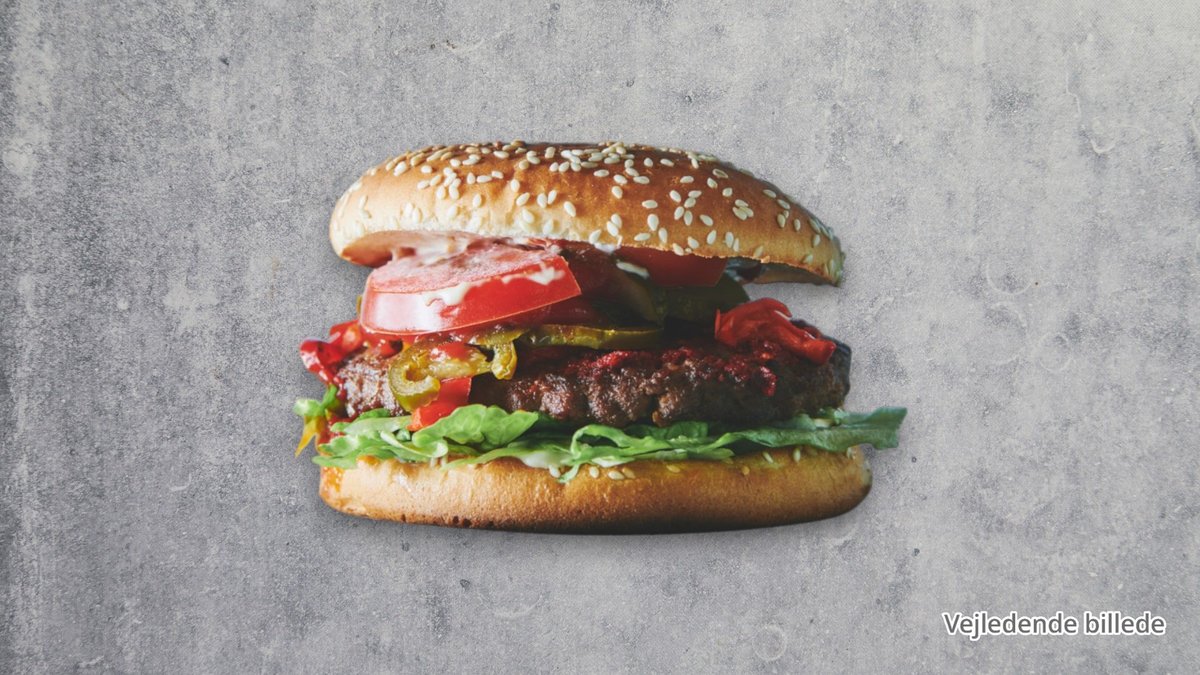 briochebolle smurt med mayo, salat, cheddarost, tomat, løg, jalapenos, guacamole, spicy chilidressing og mayo Serveres med pommes frites og mayonnaise.