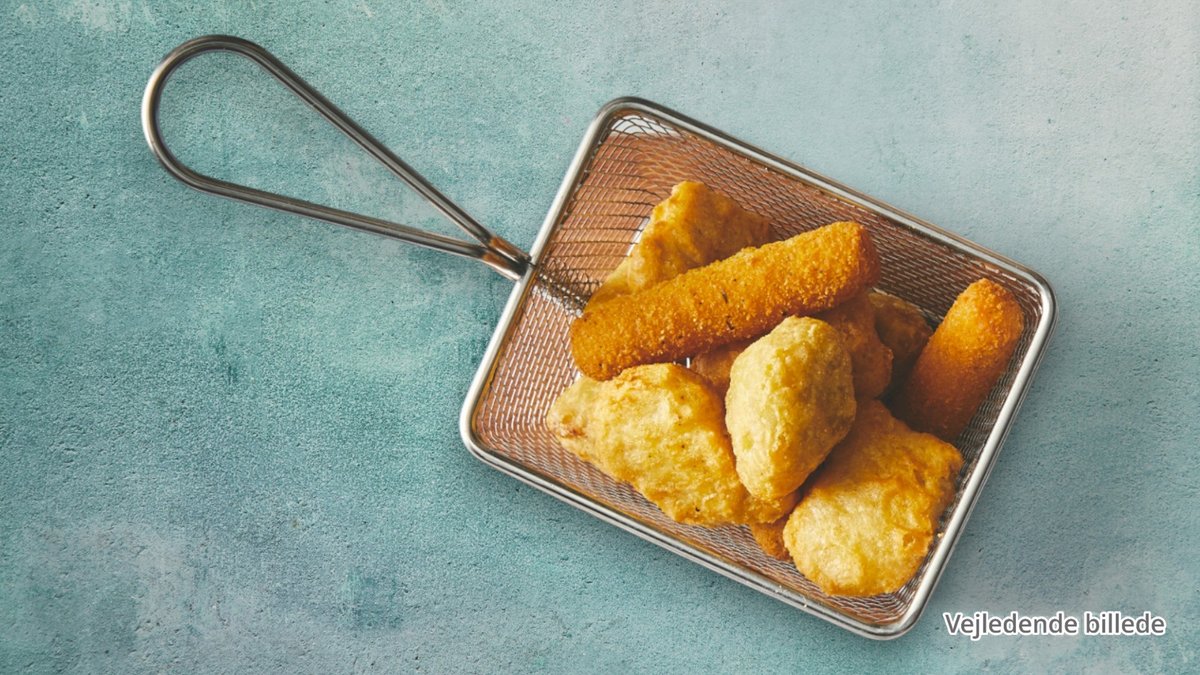 Sprøde nuggets. Serveres med fritter og mayonaise.