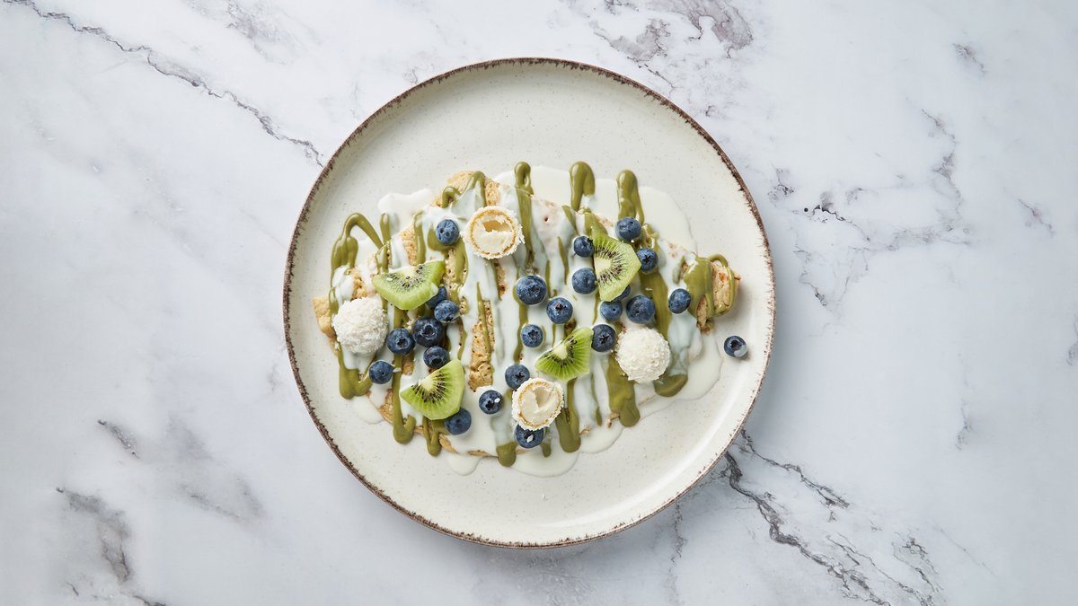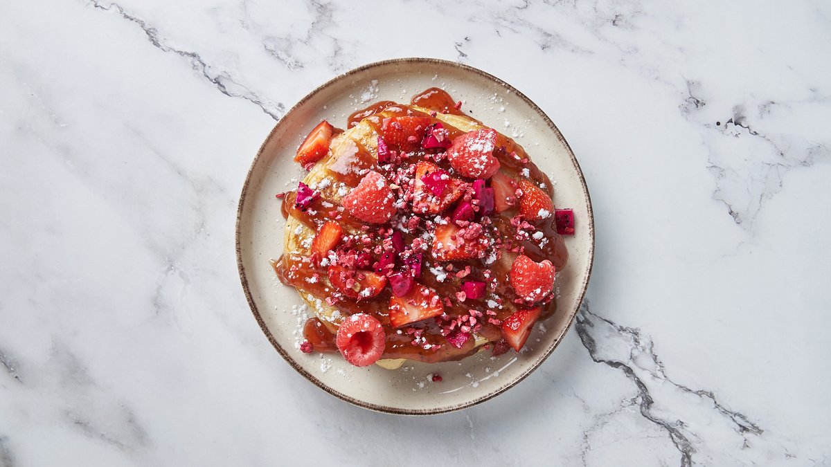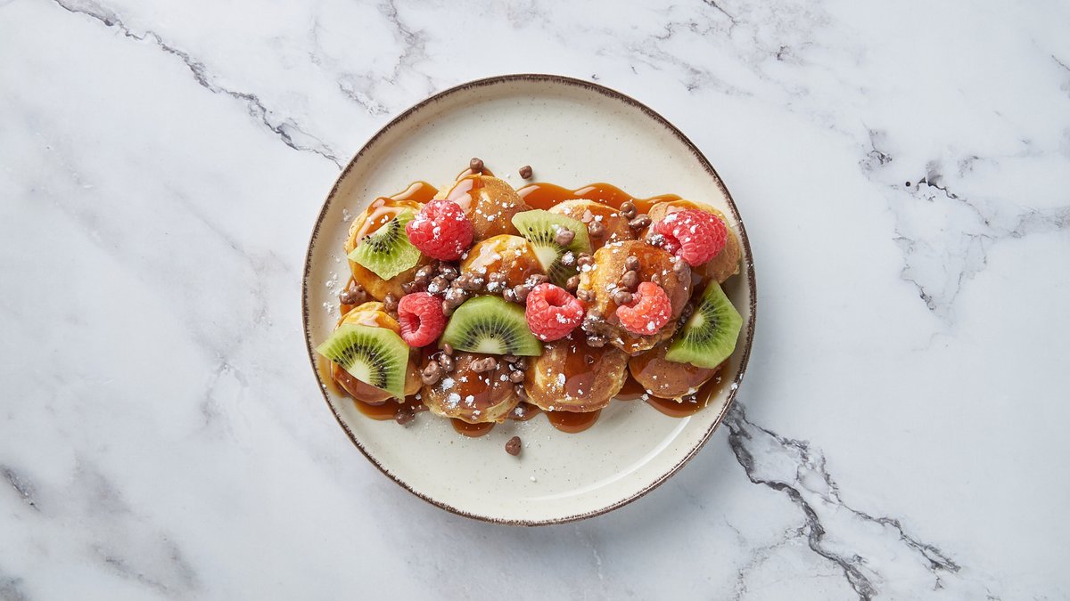 Sammensæt din egen fluffy pancake. Medfølger 2 valgfri frugter.
