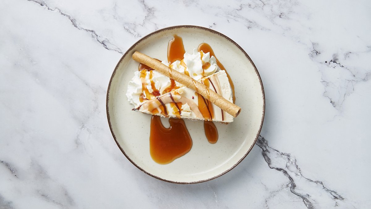Toppes med softice/vanilje scoop is, lækker sauce og hvid chokolade krymmel