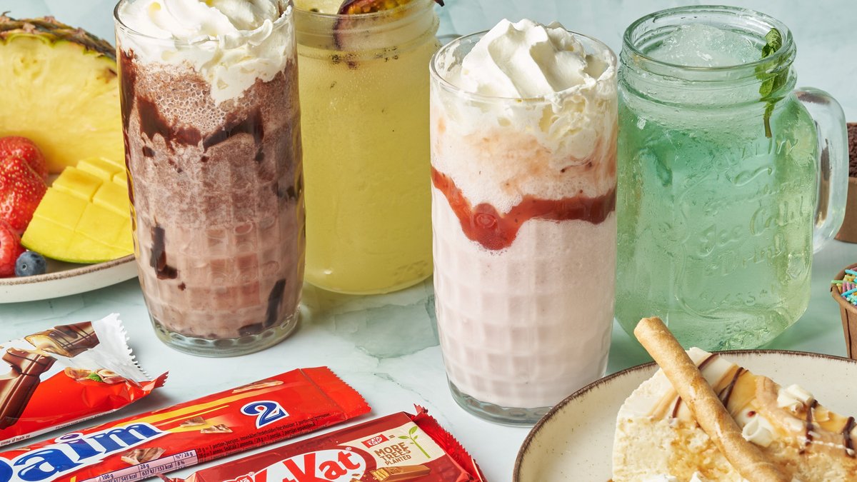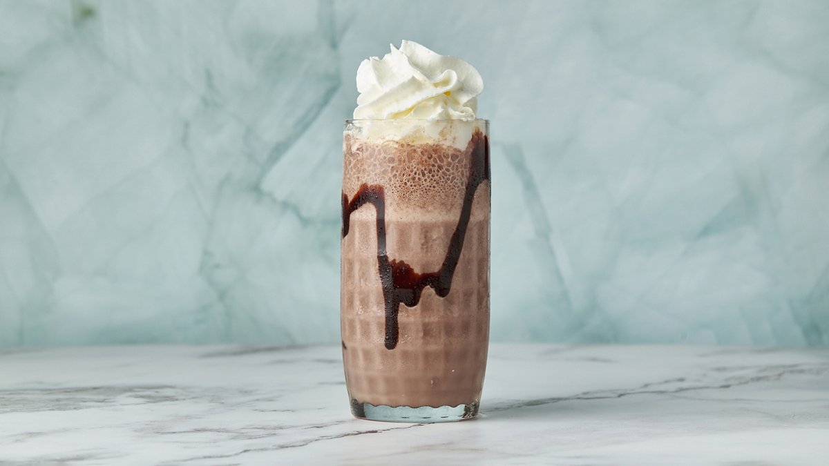 Mælk, banan og chokoladeis, toppet med nuttella, chokoladesovs og flødeskum.