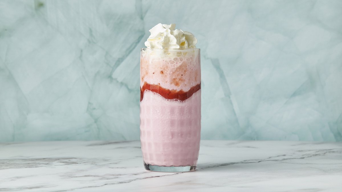 Jordbær, banan og mælk, toppet med syltetøj og flødeskum.