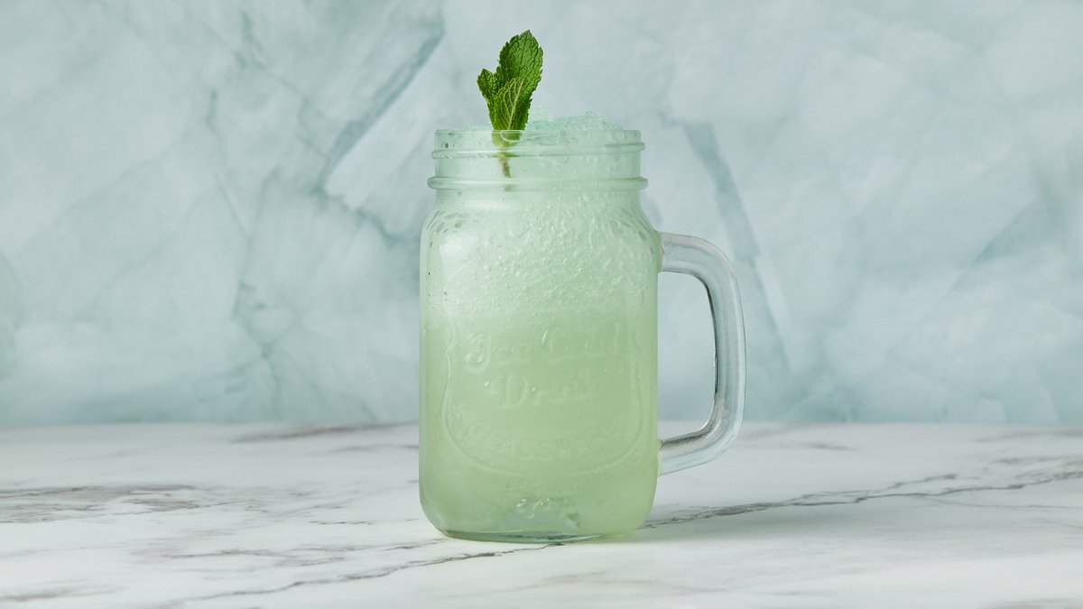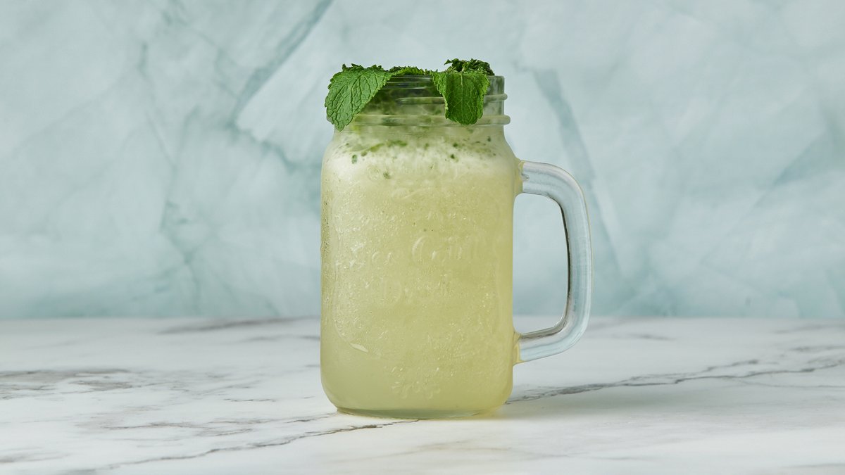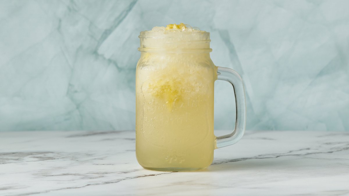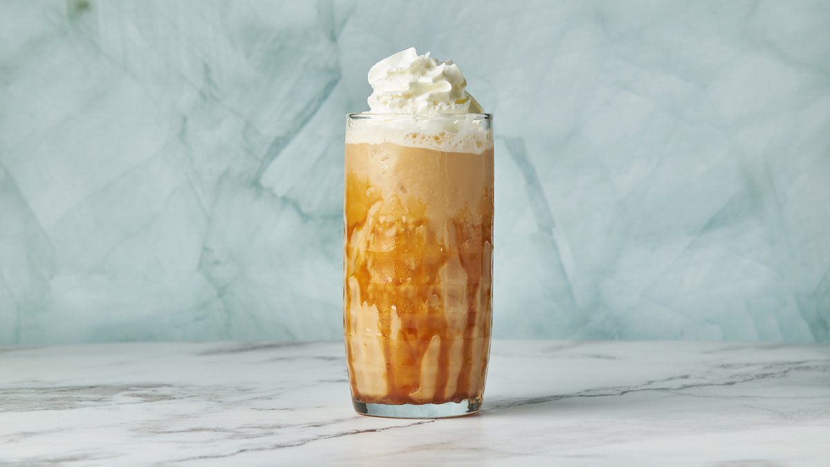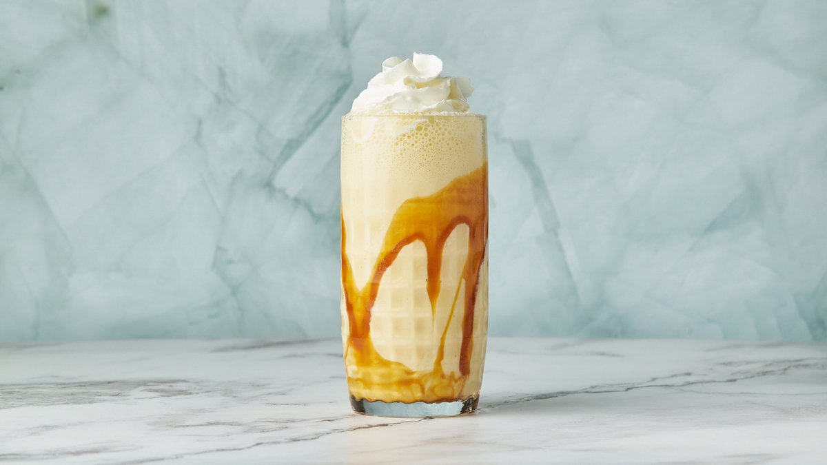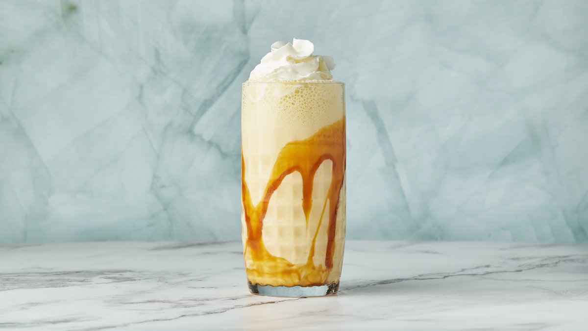 Mango sorbet, mango og mælk, toppet med karamelsovs og flødeskum.