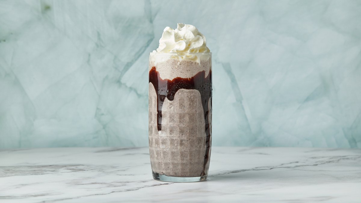 Oreo, vaniljeis og mælk, toppet med flødeskum.