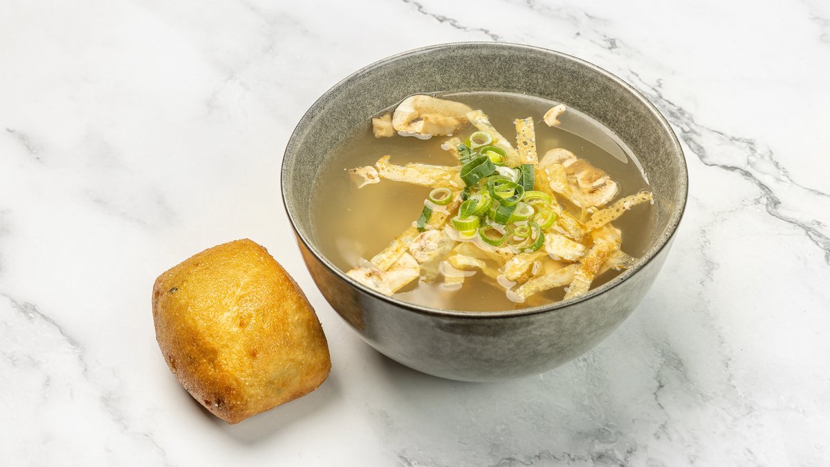 en let suppe lavet på langtids kogt hønsefond m. Hakket kyllinge bryst, champignon og æggestrimler. serveres med et stk. Siang jiangs hjemmelavet baobrød
