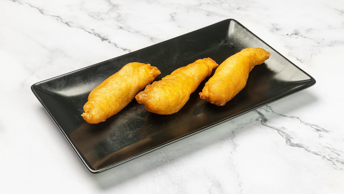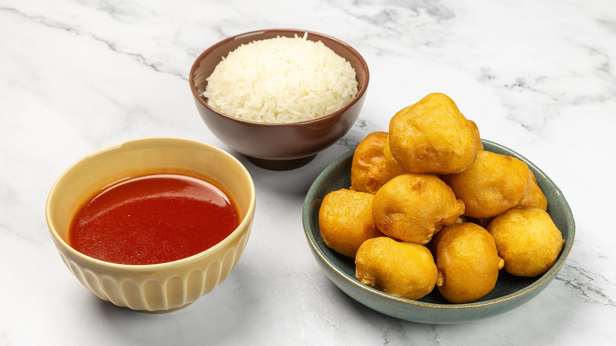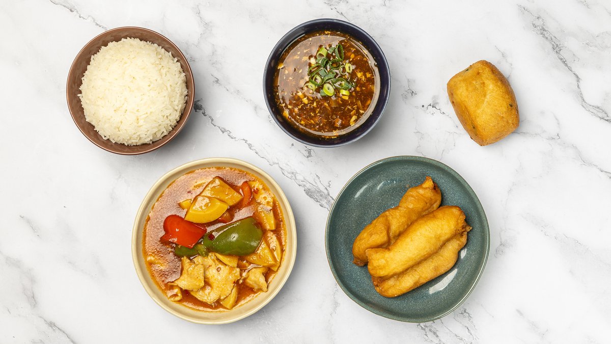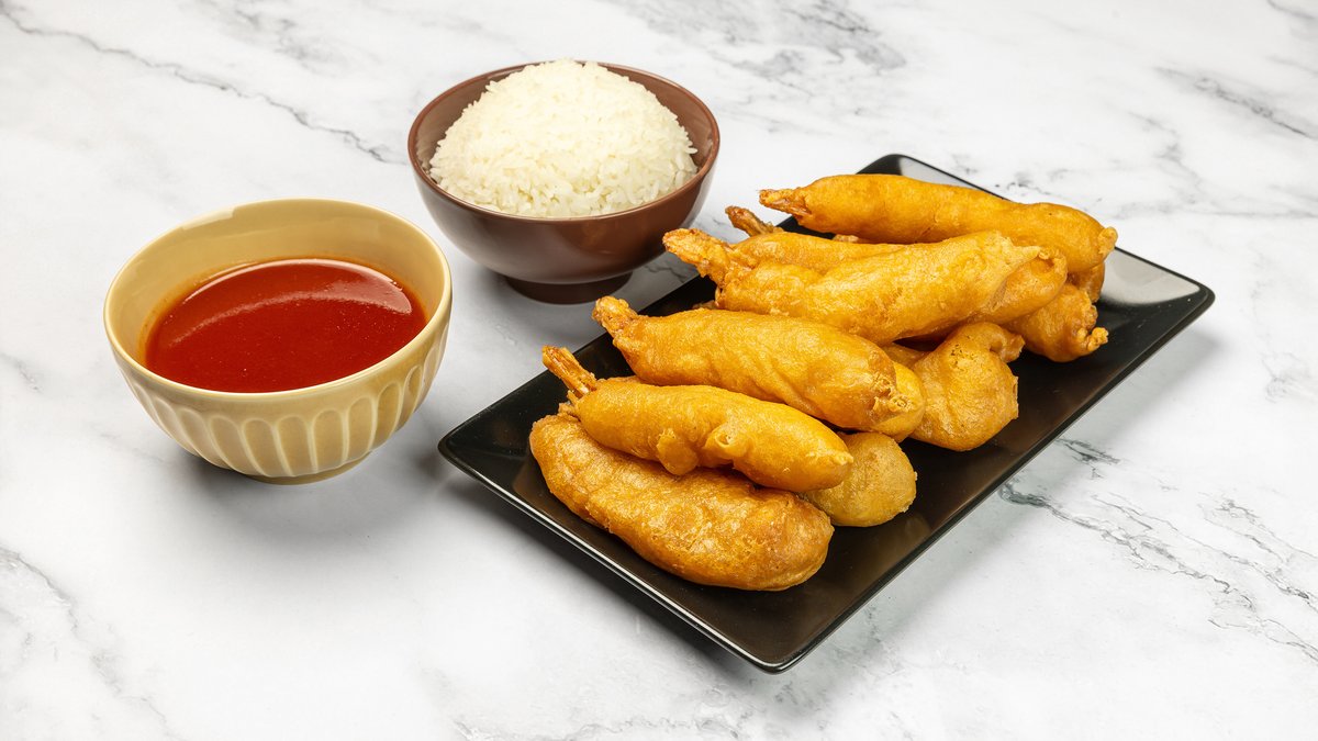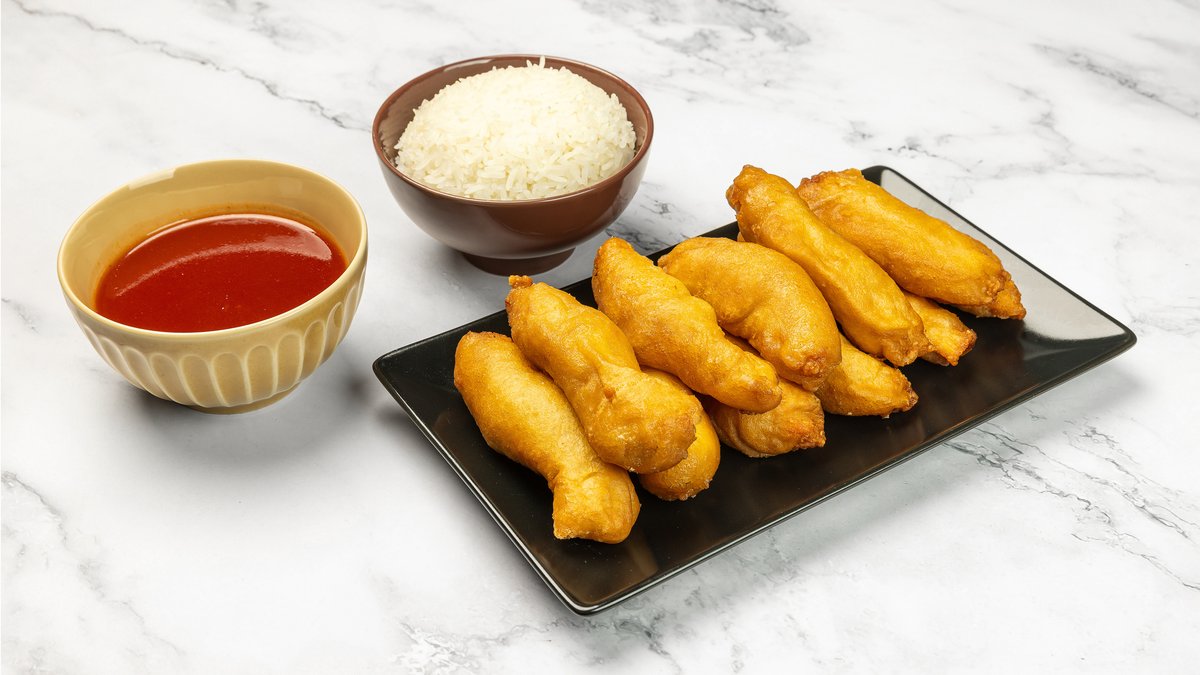 12 stykker sprød indbagt svinemørbrad med sursød sauce. Serveres med ris.
